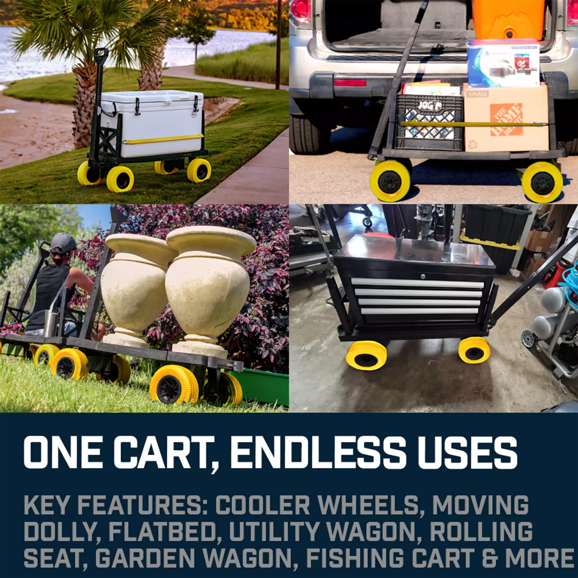 The Mighty Max Cart is perfect for any occasion indoors or out! Has multiple uses like a double-decker wagon. rolling garden seat. wheelbarrow. moving dolly. collapsible wagon. outdoor utility cart. camping cart. fishing cart. cooler caddy wheels. grocery cart. hauls large bulky items. tools. equipm