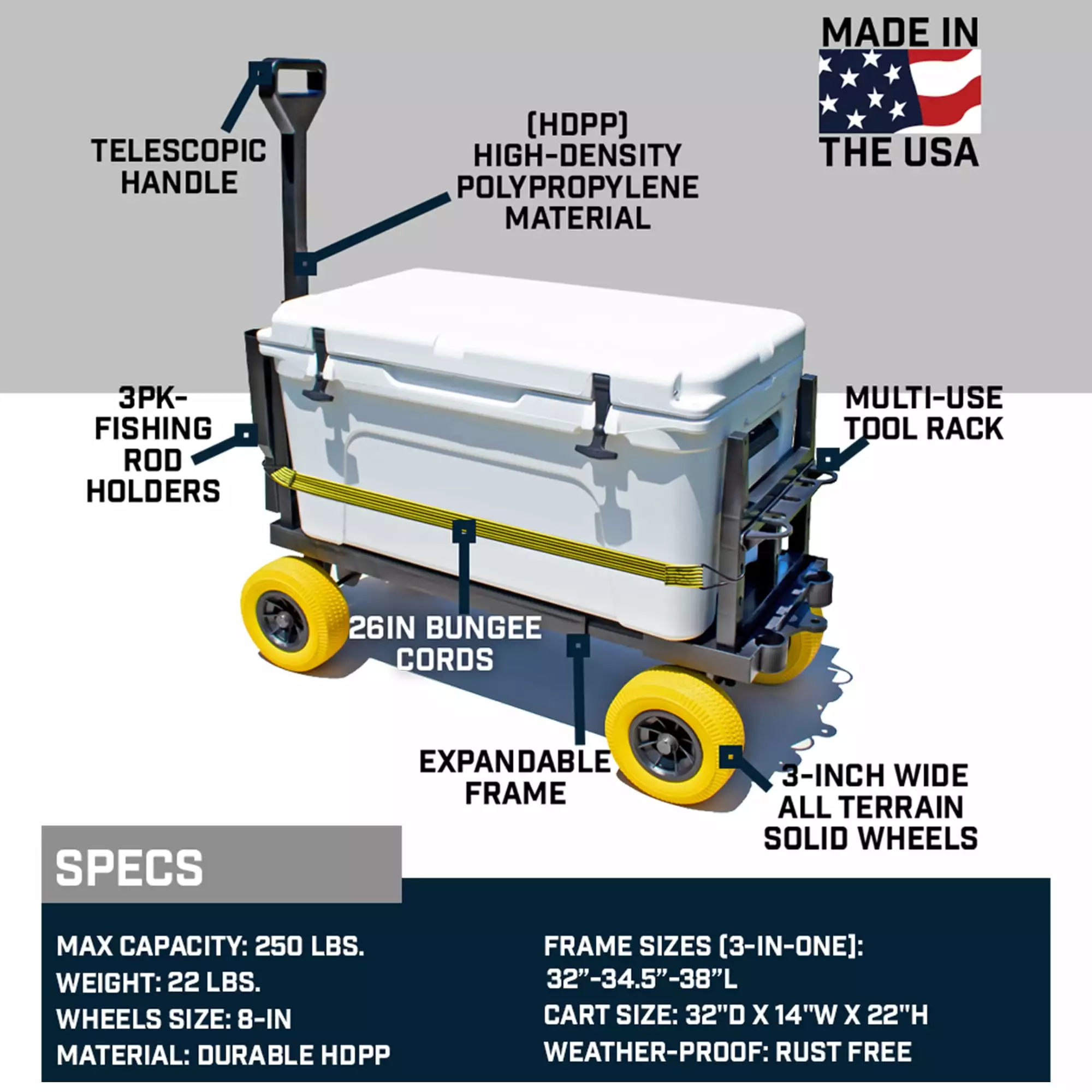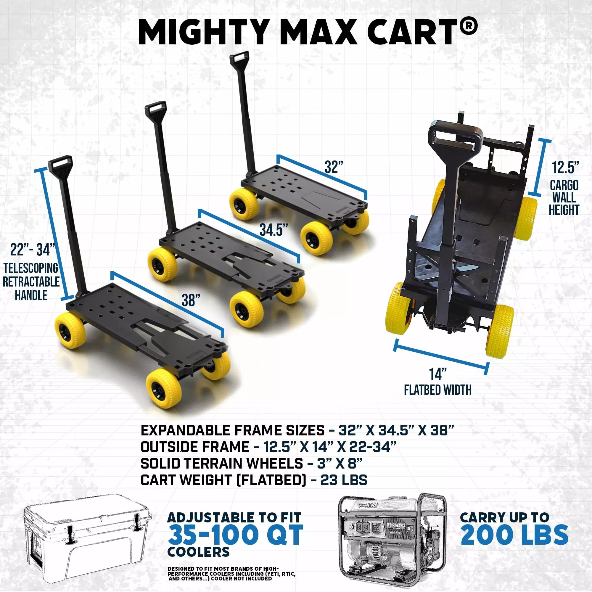 The Mighty Max Cart’s portable design is ready to go wherever your adventures take you. Easily collapse the cart in seconds to fit in the back of any car. SUV. or truck. For convenient storage. the cart can be stored in a closet or hung on a garage wall.