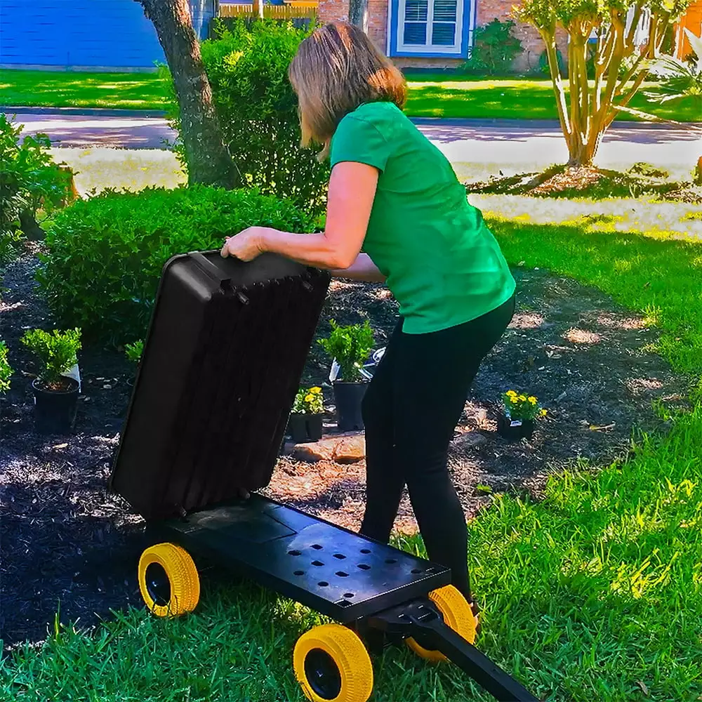 The Mighty Max Cart is perfect for any occasion indoors or out! Has multiple uses like a double-decker wagon. rolling garden seat. wheelbarrow. moving dolly. collapsible wagon. outdoor utility cart. camping cart. fishing cart. cooler caddy wheels. grocery cart. hauls large bulky items. tools. equipment & more. The poly frame is durable and won’t permanently kink. bend. or tear like metal & canvas carts.