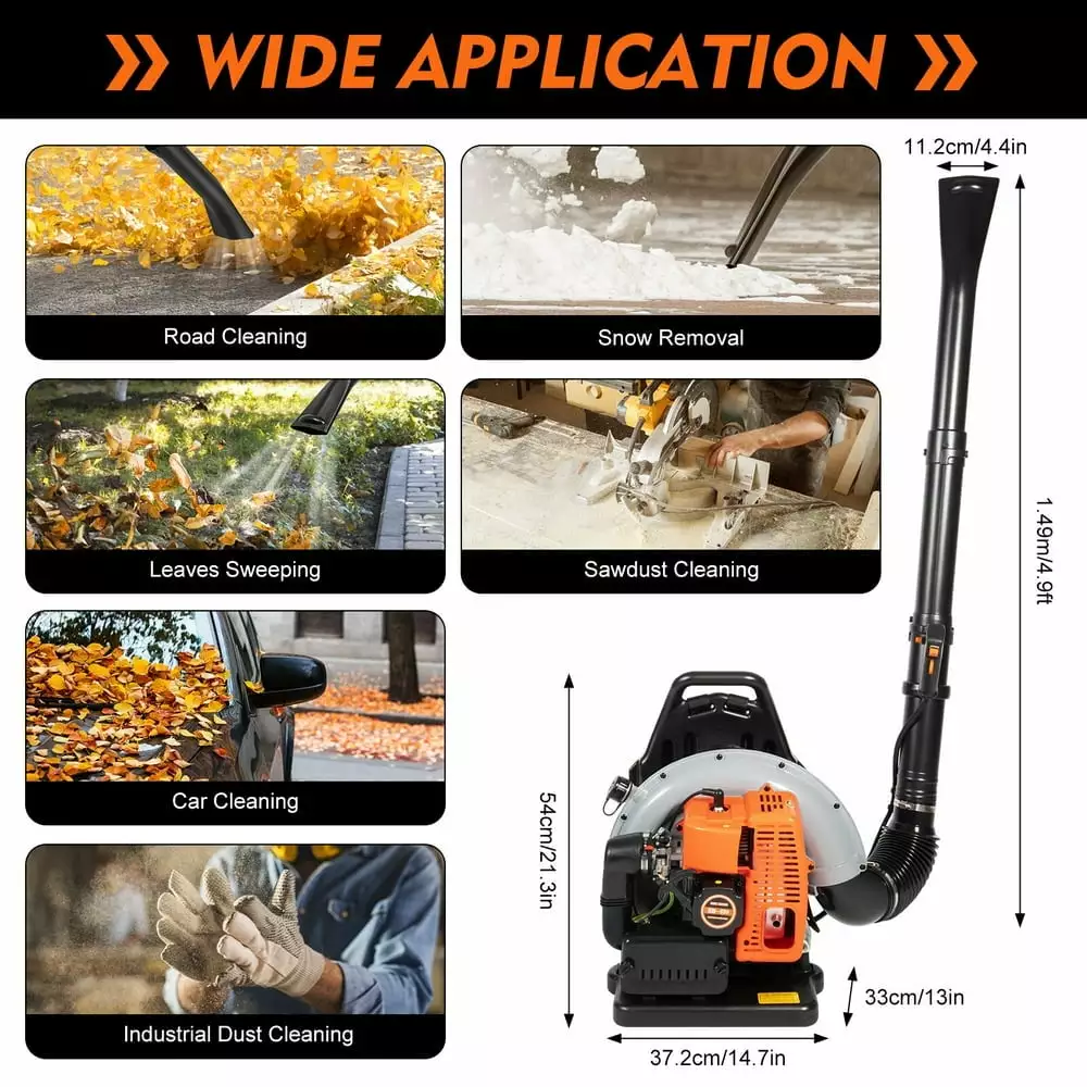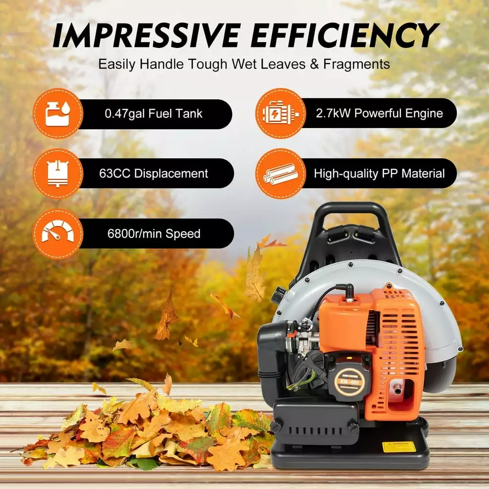 Impressive Efficiency: Its large displacement of 63CC provides a high speed of 6800r/min. Its powerful two-stroke engine (2.7kW) can quickly remove leaves. sand. hard gravel. and snow. improving your work efficiency