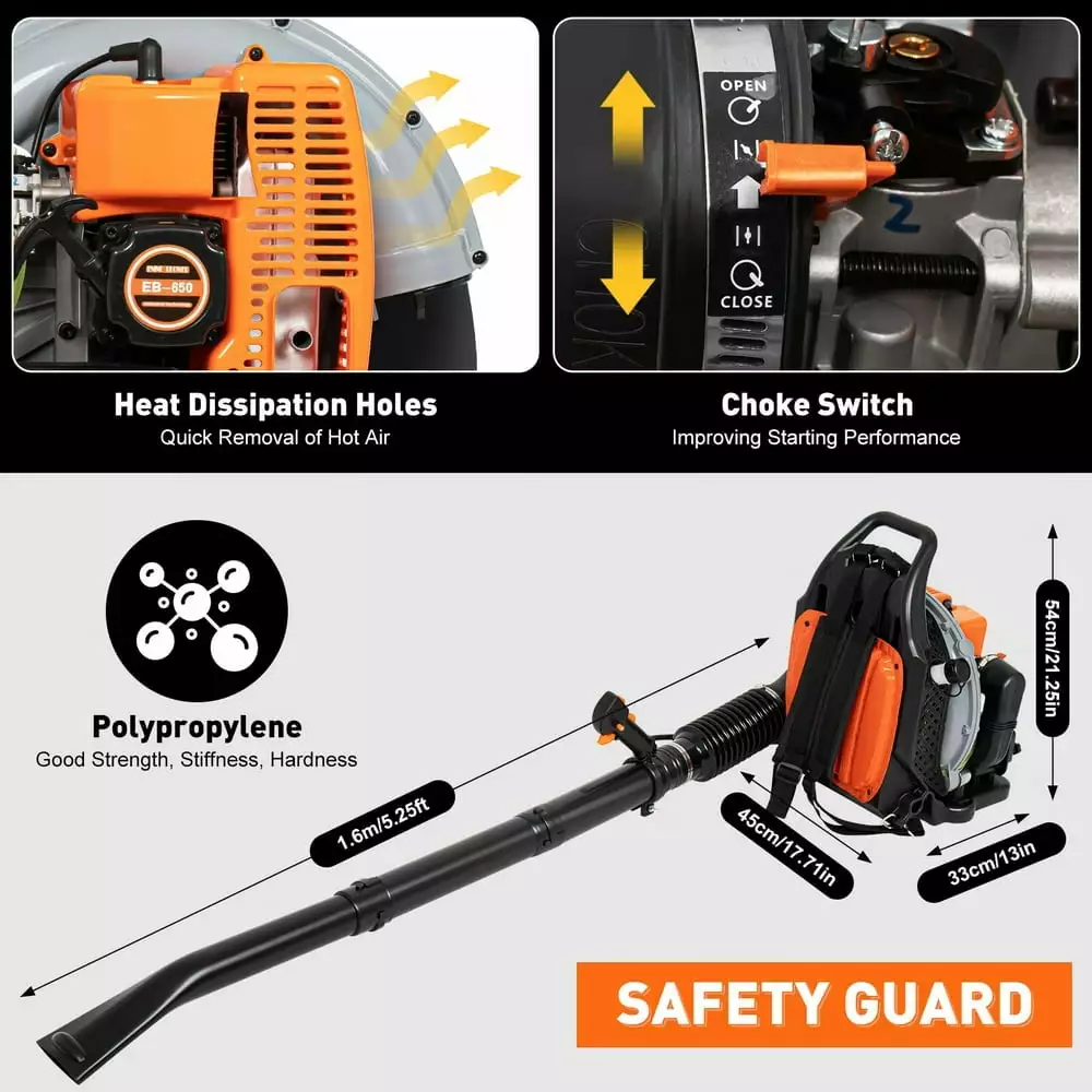 ?Simple & Flexible Operation: The control lever with infinitely variable speed allows you to control the machine with one hand. The long flame-retardant air outlet supports up and down 180 ?? adjustment and left and right 60?? adjustment. and the hose at the interface also makes it convenient for you to adjust the direction. effectively expanding the cleaning area ?Comfortable Use: With a backpack-style design and thick & breathable straps. even if carrying for a long time. you won`t feel tired or stuffy. The thickened backrest can effectively isolate the running heat of the machine from you. and even if used for a long time. it will not cause harm to you ?Safety Guard: Air-cooled mode. multiple heat dissipation holes. and one-click shutdown. effectively ensure safety during operation. This product does not contain batteries to avoid the risk of spontaneous combustion. so you can easily store it in storage rooms. warehouses. and other places after use ?Highly Efficient: A large displacement of 63cc provides a speed of 6800r/min and 79 gal/s high air volume. The powerful two-stroke engine combined with a flat vent can quickly remove leaves. sand. hard gravel. and snow. improving your work efficiency ?Large Fuel Tank: The 0.47 gal large fuel tank allows you to use the machine for a long time without the hassle of repeatedly adding fuel. The oil bubble and visible fuel delivery pipe also facilitate the process of refueling ?Good Material: It is mainly made of polypropylene and has good strength. stiffness. hardness. heat resistance