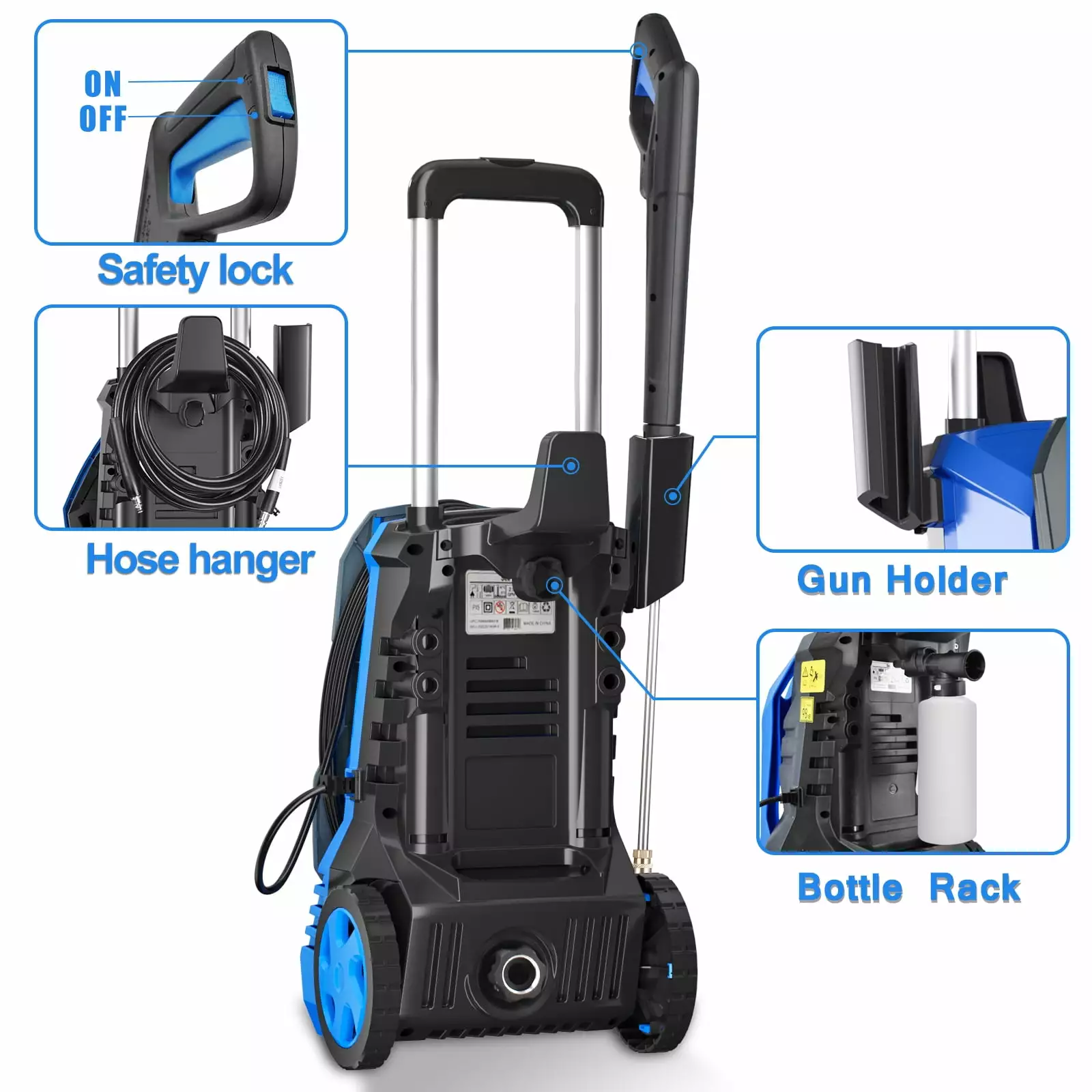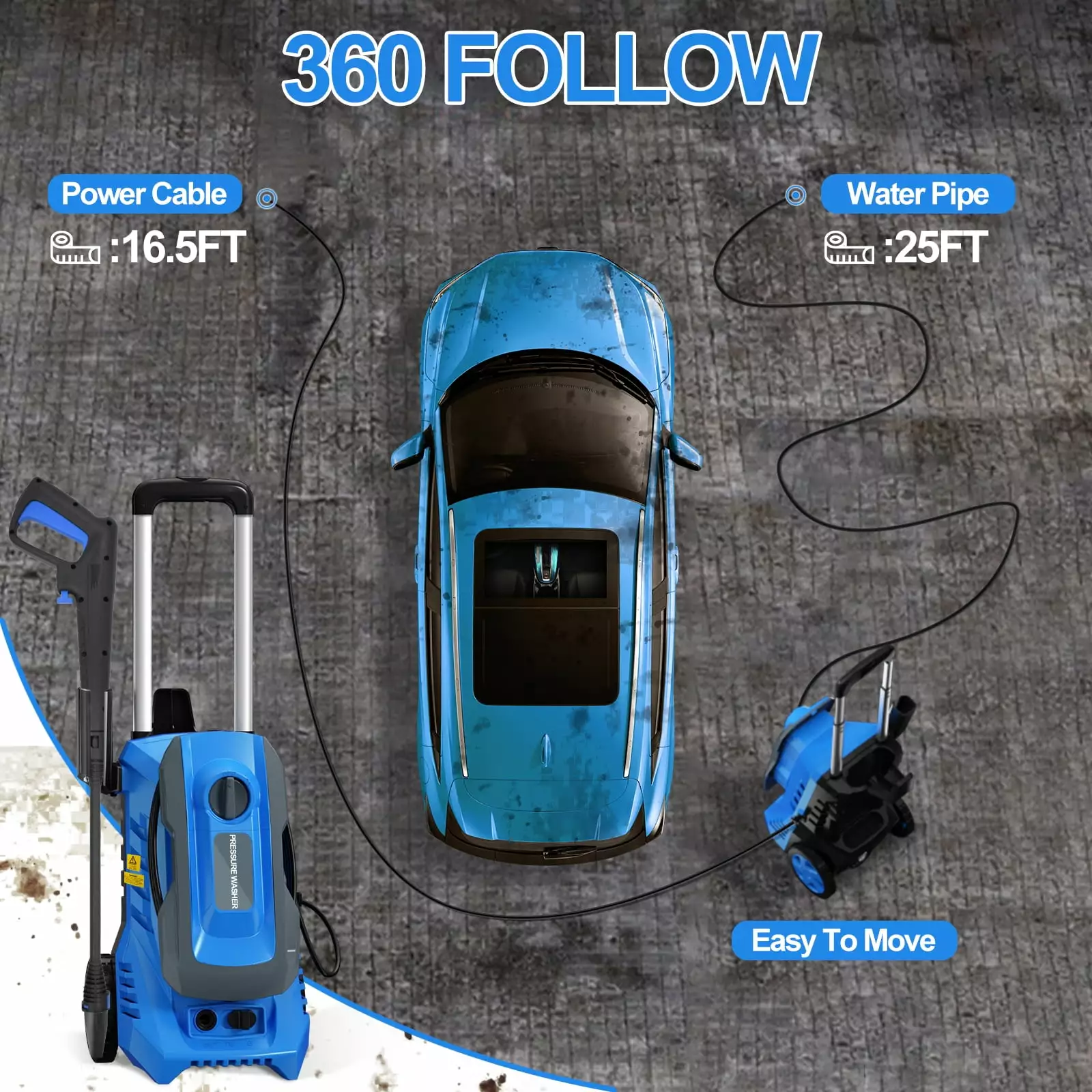 - [25FT Hose & 16.5FT Power Cord ] Comes with 25ft pressure hose and 16.5ft power cord. which make any where easy to clean. You don’t need to drag the electric pressure washer. it can help you quickly complete the cleaning task.