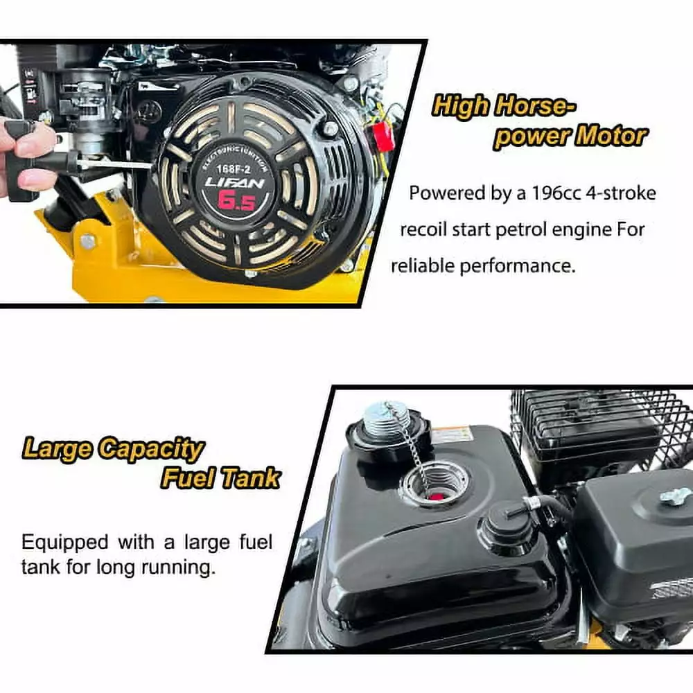 U.S. SHIPPING LOCATIONS (Our shipping service is currently only available to the continental United States. Shipping to the following states is not supported: PR. AK. HI. GU. AA. AE. AP (Please note: We do not currently ship to P.O. Boxes.) About this item Item Description. 1.196cc / 6.5 HP LIFAN Engine 2.Compaction force of 2500 lbs/ft² at 5488 blows per minute 3.Travel speed of 82 ft. per minute 4.Compact 21 x 14 in. plate works around cramped and narrow spaces 5. EPA compliant Professional Machine: Our self-propelled plate compactor has a 196cc/6.5HP engine. delivering 10 inch compaction depth of 2.500 lbs of compaction force and 5.500 vibrations per minute; Raising the density of loose dirt. soil. gravel. sand. asphalt and other media to form a strong & level foundation. Efficient & Easy Operation: Speed up the throttle. the 21”x14” one-piece plate tamper can travel 82 ft/min. working efficiency up to 5600 ft²/h. The reasonable weight of 134 pounds and compact form factor make it easy for any adult to use. Comfortable & Easy to Move: Our compactor machine has a specially designed shock absorption system. improves operator comfort and reduces fatigue. Also. the folding transport wheels kit makes it easy to move around your workplace and store it. Precautions: Read the user’s manual before using. Check if the nut is loose before each. or tighten it in time. Always wear a hand & eye protective tool when operating. Use unleaded 86+ octane gasoline for engines (0.95 gal max capacity) and SAE 10W-30 engine oil (0.16 gal max capacity). ENGINE OIL IS NOT INCLUDED.Plate Compactor Rammer. 6.5HP 196cc Gas Engine 5488 VPM 2500 LBS Compaction Force. 21 x 14 inch Plate. Ground Compactors for Paving Landscaping Sidewalk Patio. EPA Compliant