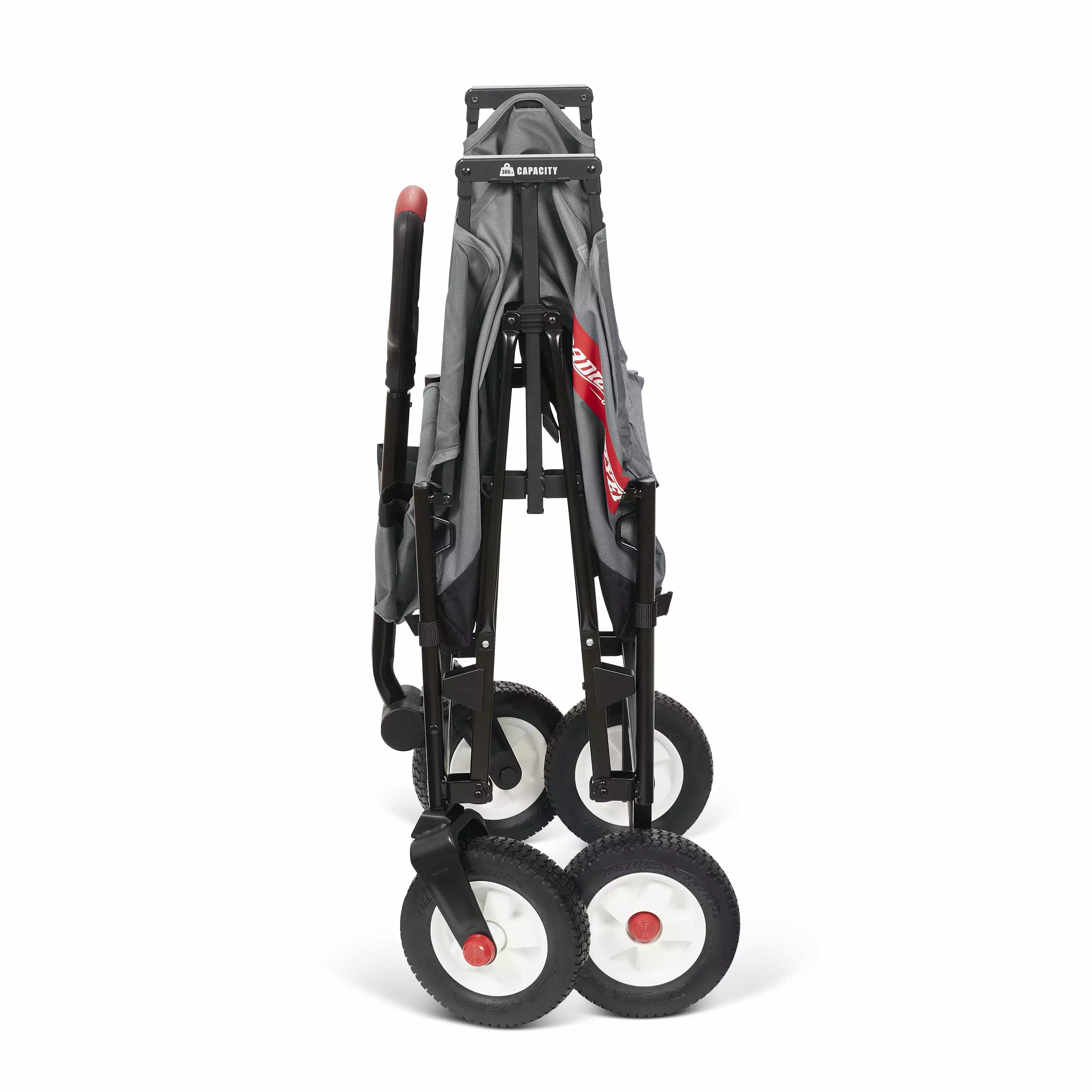 The Beast Wagon by Radio Flyer is designed as a full-sized. heavy-duty collapsible utility wagon ready to haul up to 300 lbs. of kids or cargo. Equipped with off-road puncture proof tires. premium fabric and our deepest folding wagon frame. The Beast can carry it all. anywhere you need to go. Sports or camping equipment can evenly be stored across the top rails while the rear storage pouch offers additional cargo hauling. The easy one-hand-fold allows the wagon to be taken or stored anywhere. This wagon passes the toy safety standard and has padded seats to add comfort for your child. The Beast also features two front cup holders and a rubber comfort grip on the NeverFall? pull handle. which stays upright when not in use. For ages 1 ½+ years. Maximum weight capacity 300 lbs.