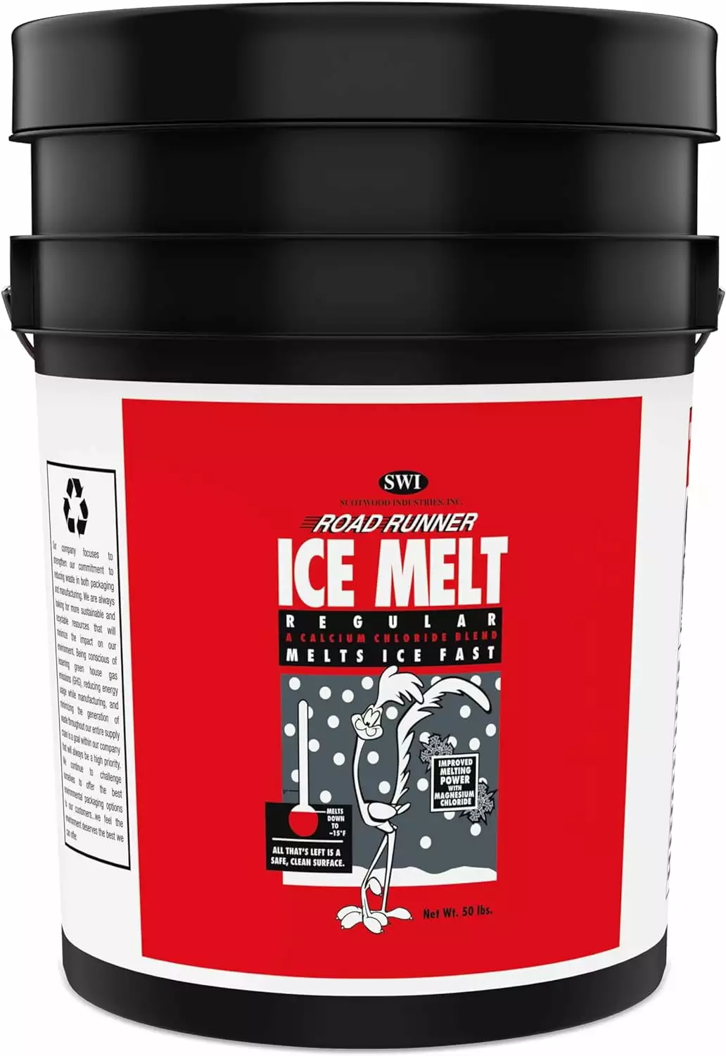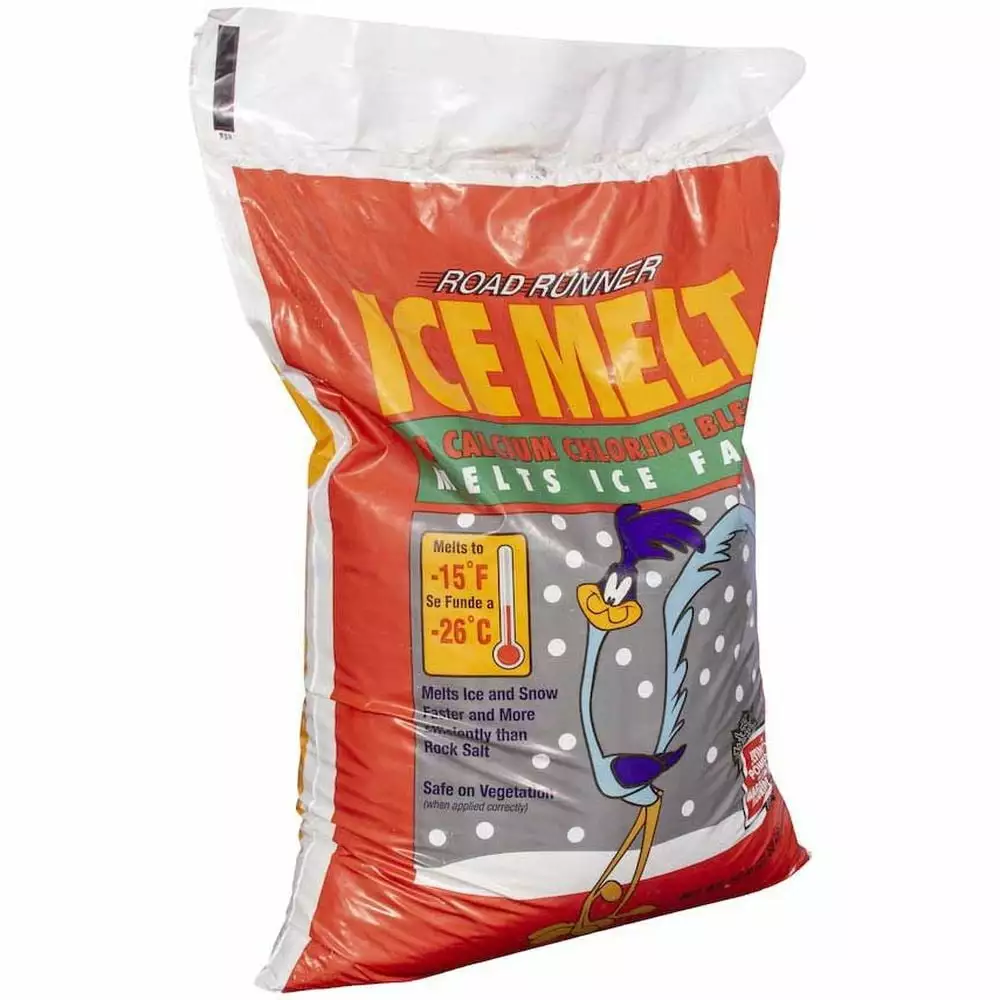Road Runner Ice and Snow Melt Fast Acting Scotwood Industries Pail. 2 Pails of 50 Lbs Total 100 Lbs. Ice Melt 50-Pound is an effective blend of calcium and magnesium pellet. potassium. and sodium chlorides. Road Runner ice melt is safe to use on driveways. sidewalks. and steps when applied as directed.