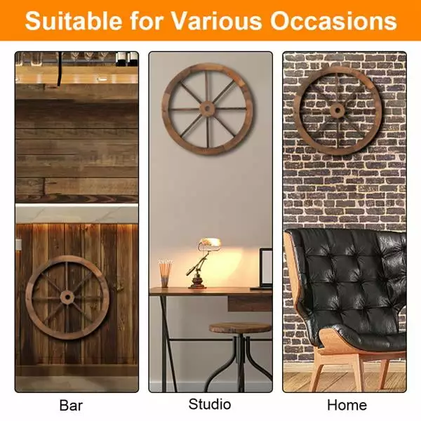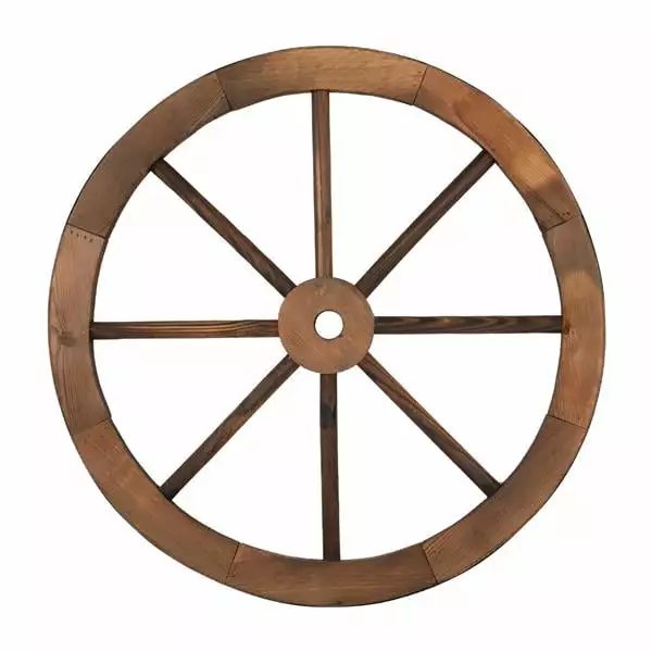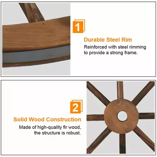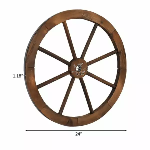 Add some rustic charm to your yard. patio. studio. bar or workplace with the Decorative Wooden Wagon Wheel! This beautifully crafted wagon wheel is inspired by antique western design and will be a perfect decor for any indoor or outdoor space. It is constructed of high quality fir wood and the wheel is reinforced with sturdy spokes. Carbonized wood feels smooth and lasts for years. No assembly is needed. Simply display it on a front porch. on the side of a garden. or next to a fireplace for perfect accent.Features: