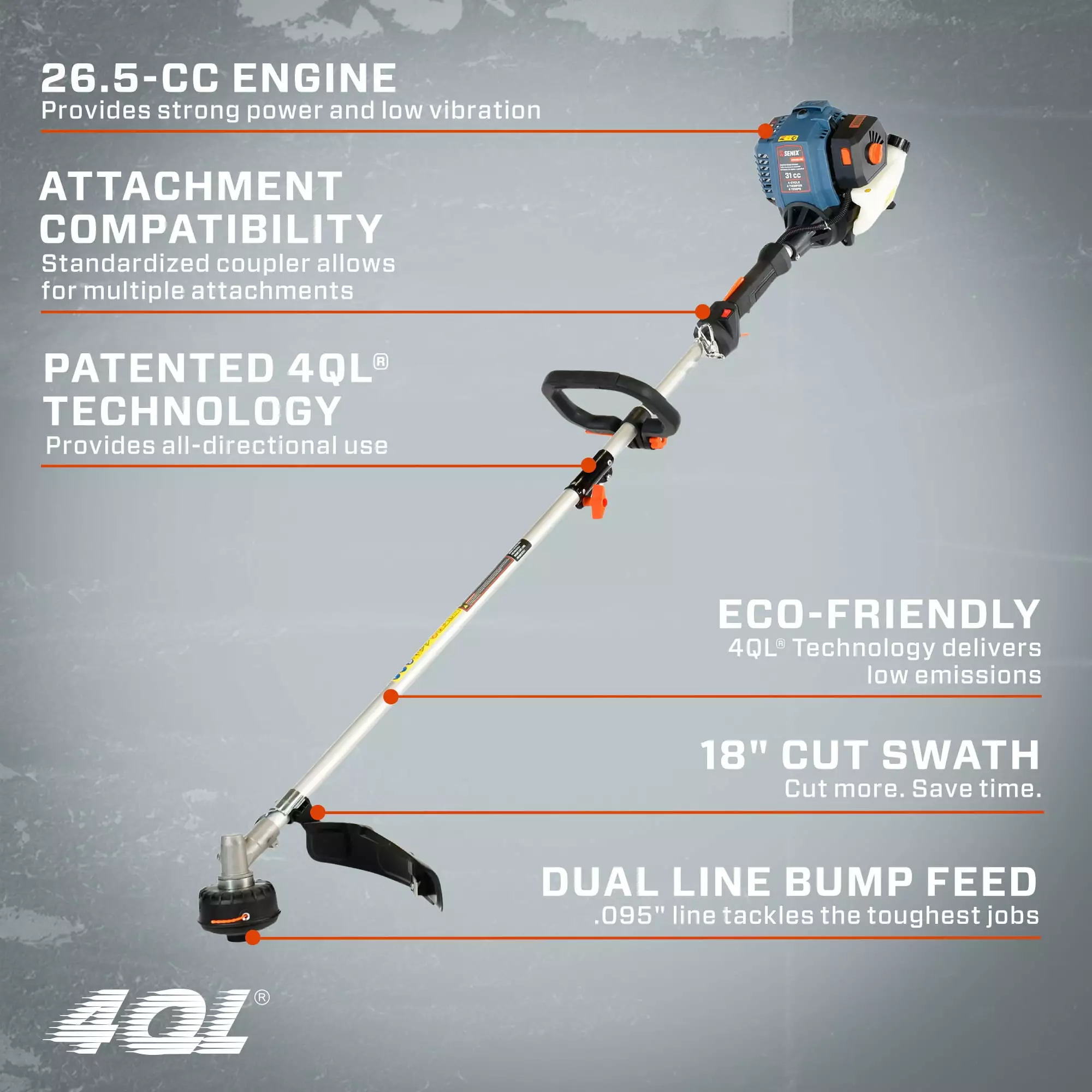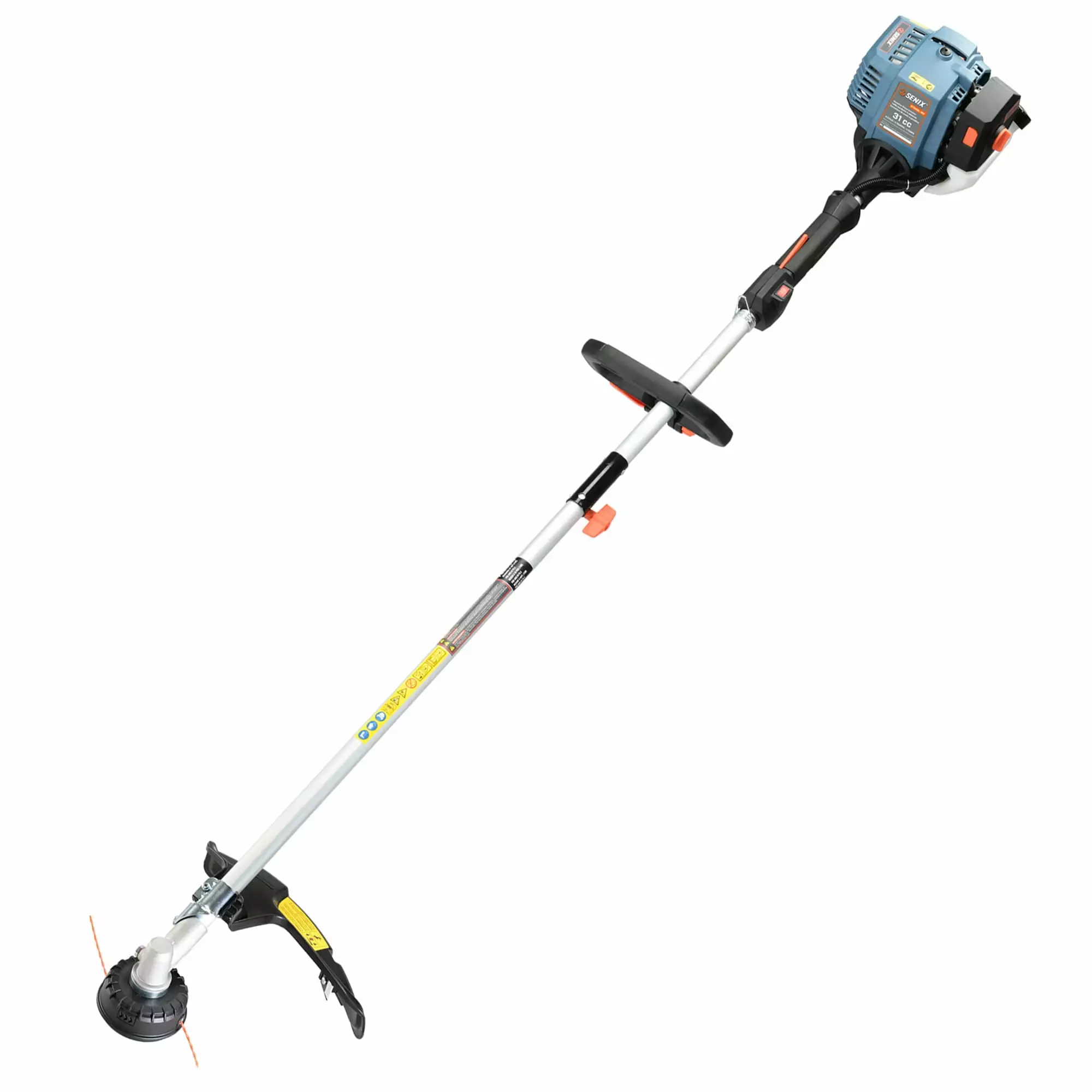 Maintain a clean and weed-free yard throughout the year with the SENIX 4QL Gas Powered 31cc Straight Shaft Outdoor Grass Trimmer. The cordless feature allows for a seamless experience with extended reach without the hassle. fumes. or mess of gas. The string trimmer has a high-performing brushless motor that runs a dual 0.095 line bump feed cutting head. Comfort is not a problem with a built-in 360-degree front handle that allows for a better cut at any angle. Featuring an adjustable 17.7-inch cut-off blade. the trimmer can make cutting through the toughest weeds twice as fast and more efficient. Built with power in mind. the 31cc 4QL 4-cycle full crank engine provides strong power with low vibration. Standardized coupler allows for multiple attachments for a variety of applications. With minimal maintenance and no direct emissions. this SENIX Gas Powered 31cc Straight Shaft Outdoor Grass Trimmer could be your ideal companion for lawn care and yard improvement for years to come.