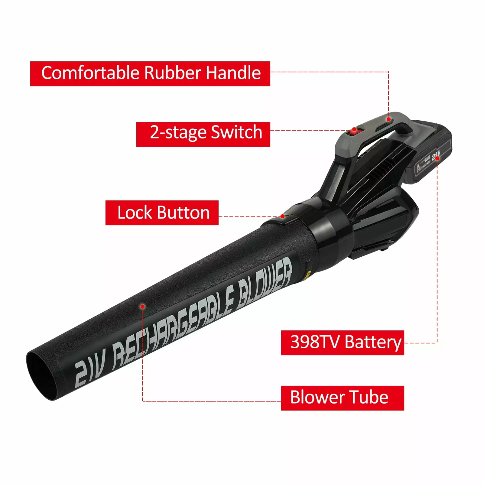 - 3 Steps Quick Assemble saves your time. Insert the blower tube. nozzle. and battery successively. one press to start. The speed/lock dial can lock the speed and keep the output. convenient for continuous operation without holding the trigger all the time.