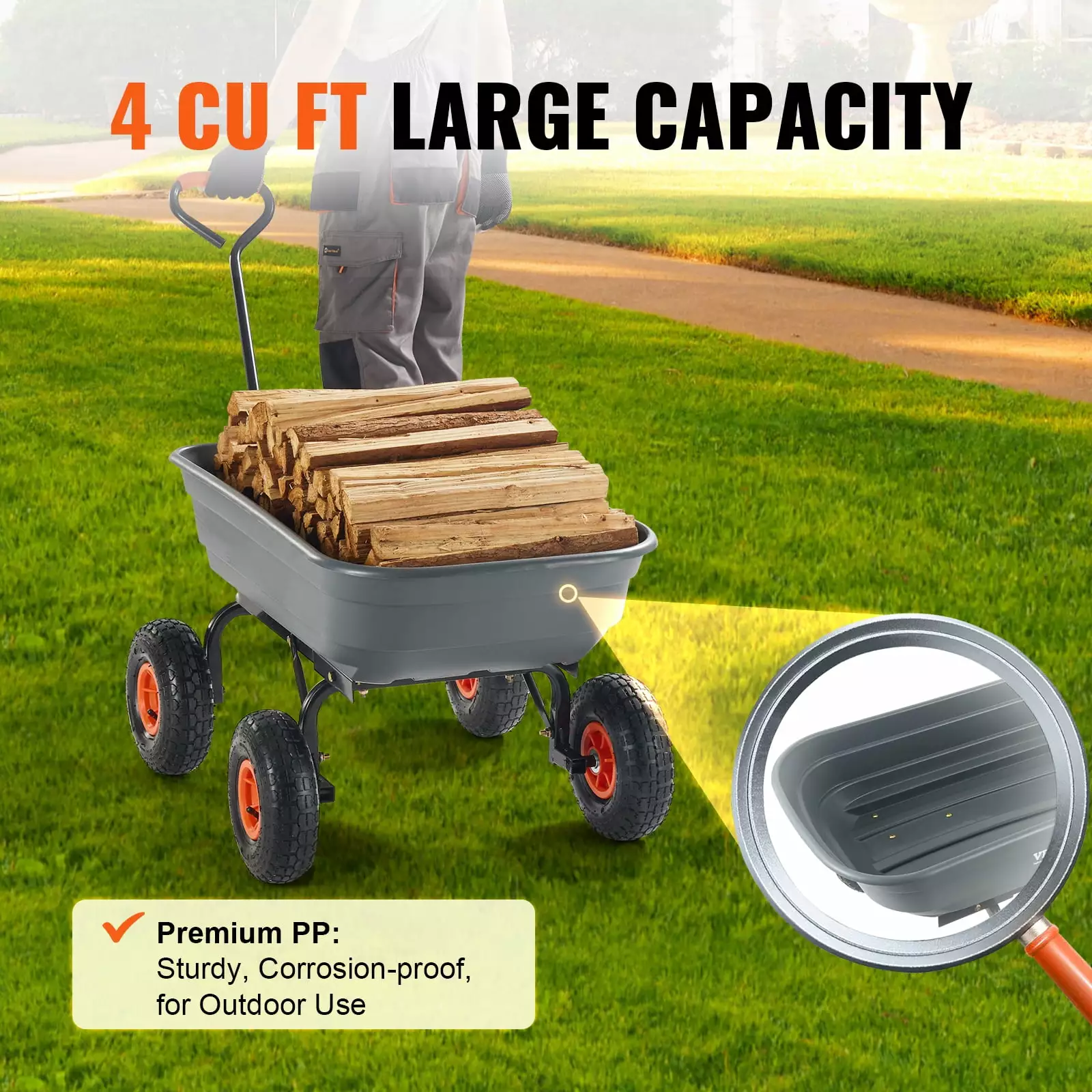 - Large Tire Size: The garden car uses ?255mm / 10 rubber tires with excellent shock absorption and can be driven on uneven garden terrain or grassy slopes to ensure smooth transportation.