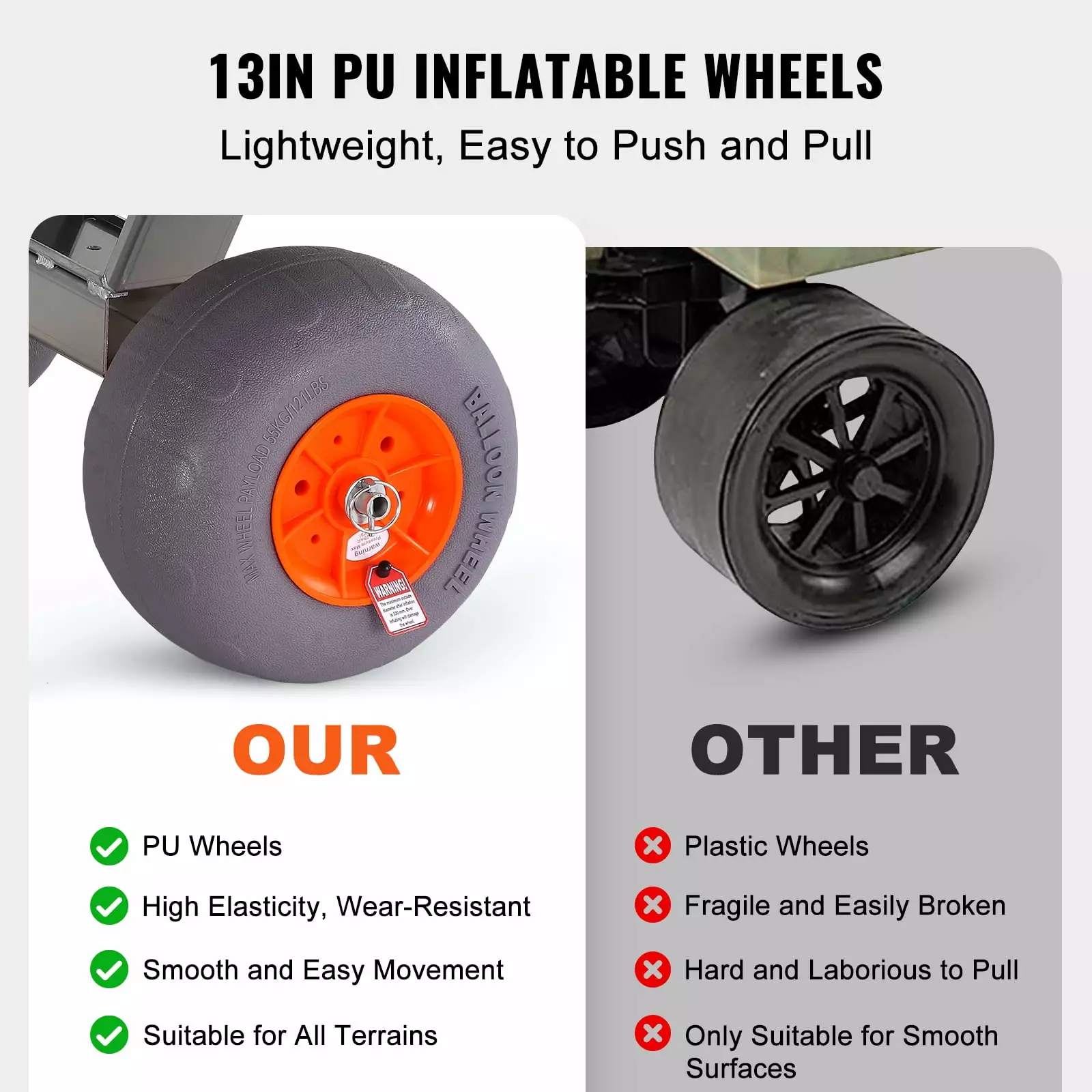 - Practical PU Wheels: This fishing beach cart is outfitted with 13-inch PU inflatable wheels that glide over sand. mud. gravel. and grass like a dream. These wheels don’t just carry your load; they make your journey to the perfect fishing spot as smooth as your favorite fishing line.