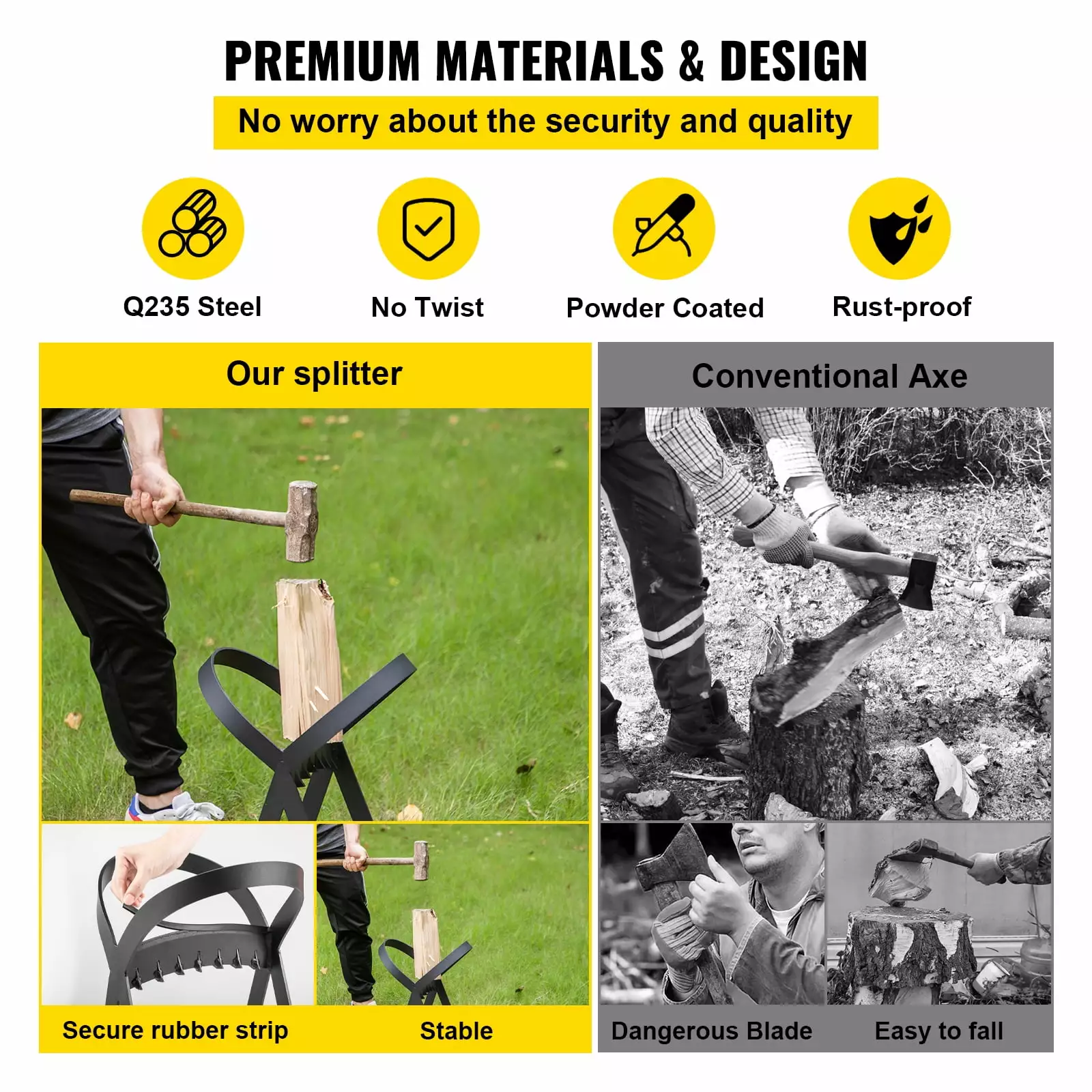 - Secure & High-efficient: Our firewood splitter features a top ring to ensure security. no sharp object or moving blade passing by your hands. Just put the log on the blade. and hit down it with a hammer or mallet. So even women. the old and children can enjoy the splitting work.