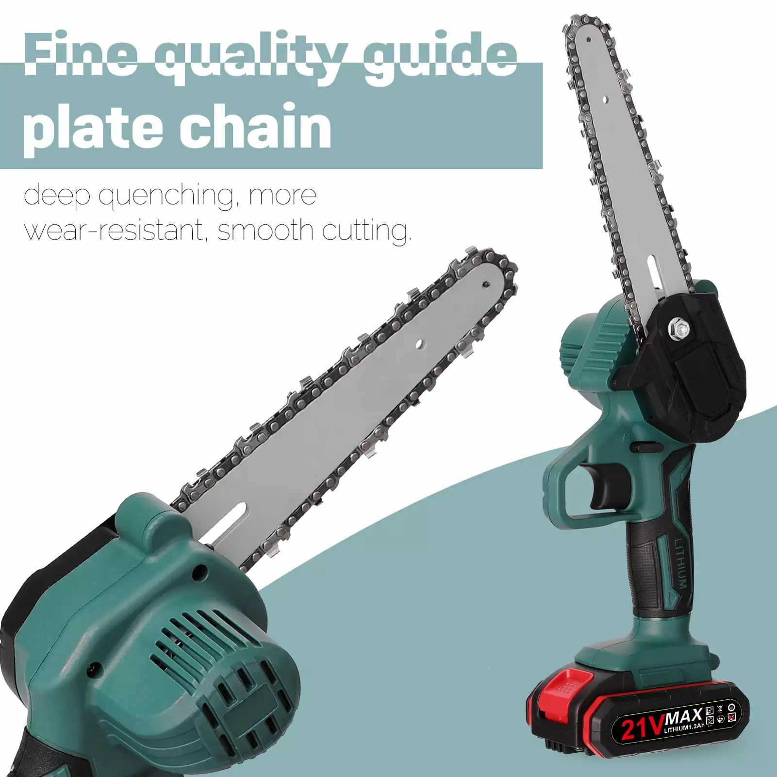 21V Portable Mini Electric Pruning Saw Rechargeable Small Wood Spliting Chainsaw One-handed Woodworking Tool for Garden Orchard Branch Clip: Ergonomic handle design. one hand use. long time griping will not tired hands.With high working efficiency. high positioning accuracy. low noise. which can give you a better using experience.Compare with other type of chainsaw. this chainsaw is proper size and also light. so you can hold and use it more easily. which can be used for more people.Cordless design. lightweight and portable. easy to carry out and saw the wood.The sawchain has been deep quenching by high temperature. with sharping sawteeth. more wear-resistant. smooth cutting.With quickly cutting speed. which is practical and low power consumption. high stability and high performance.