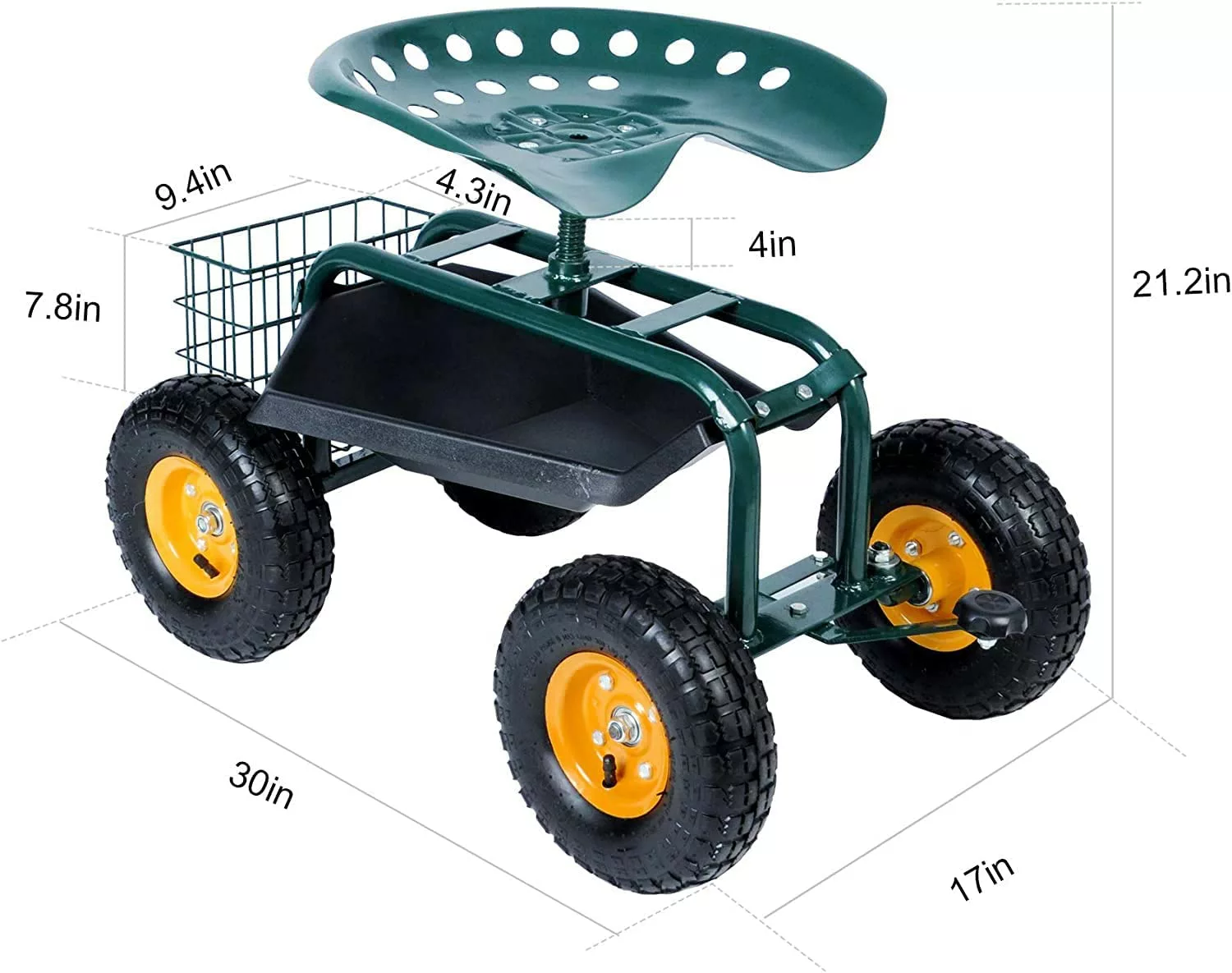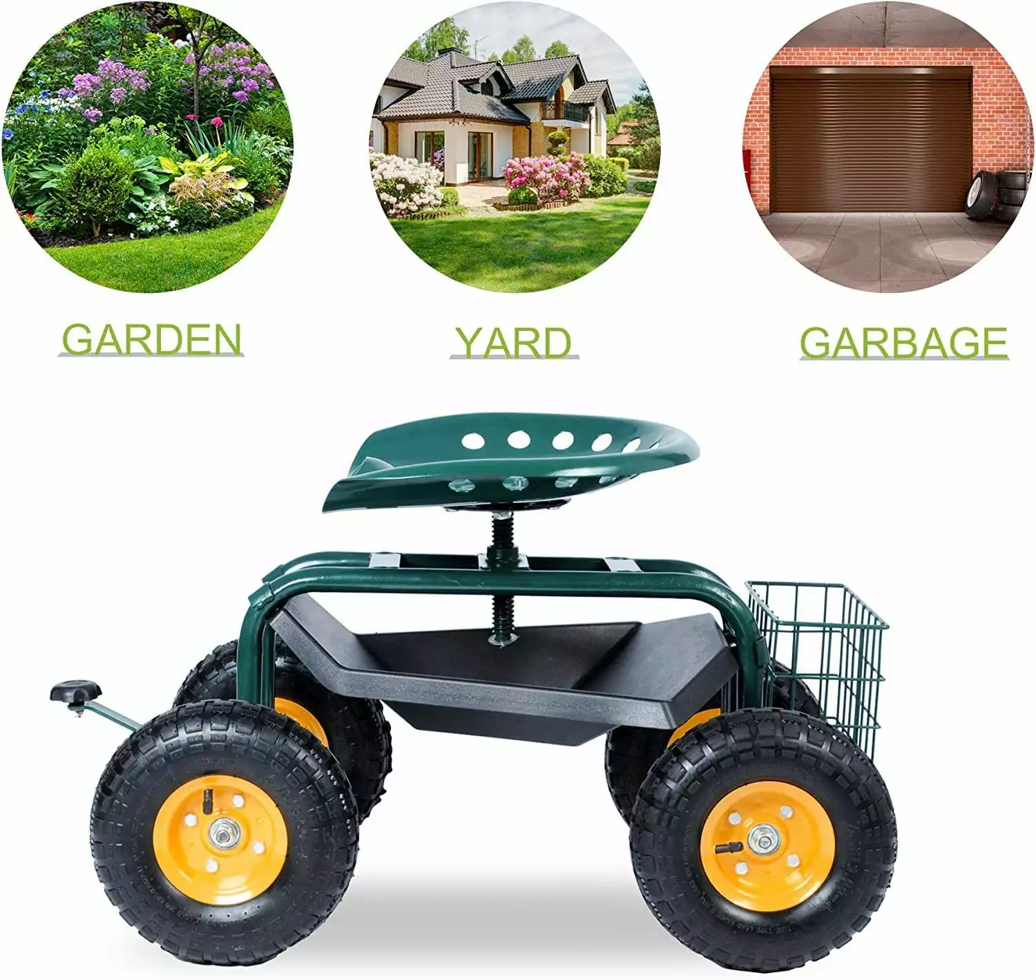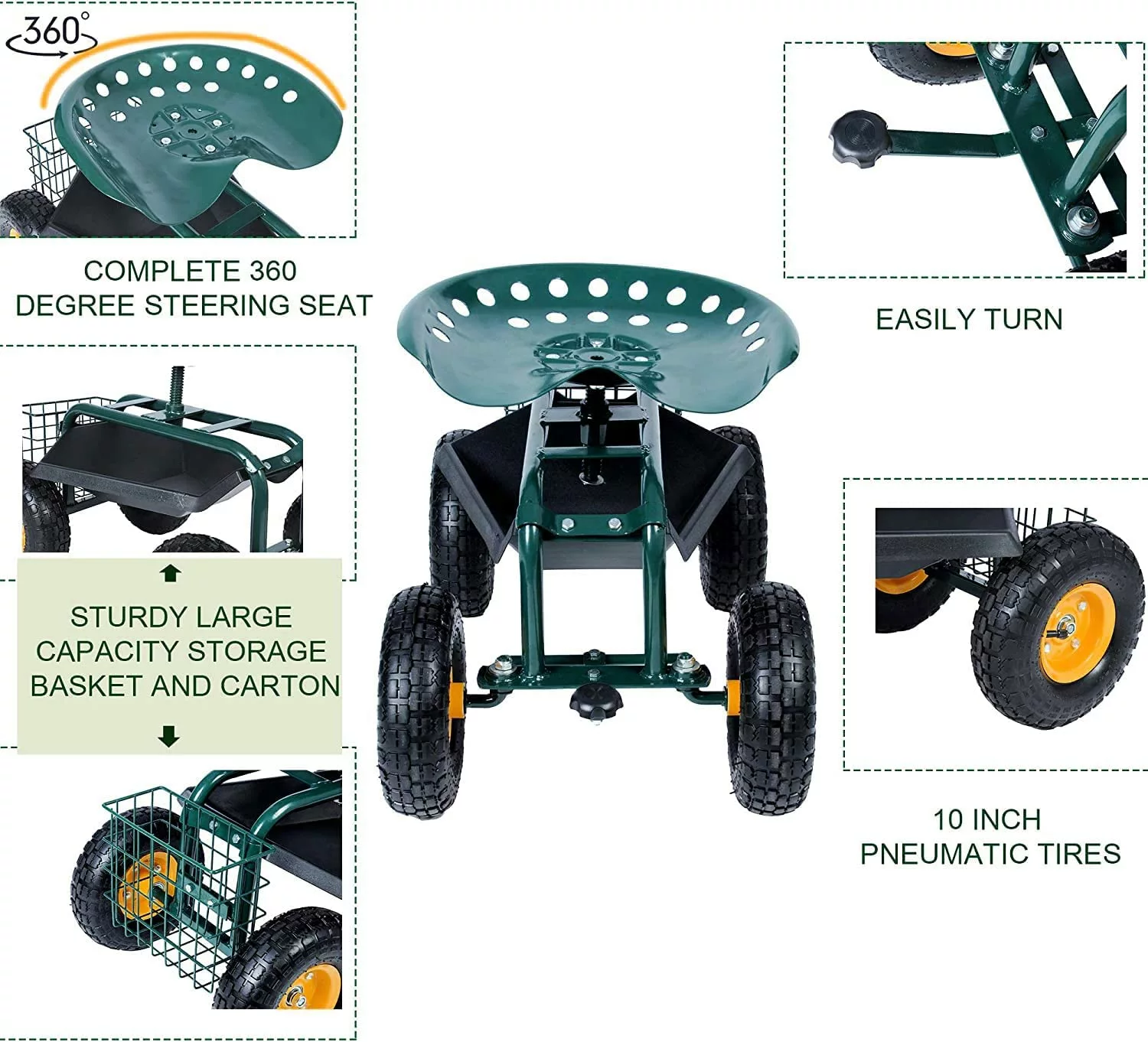 - Steerable Seat and Front Wheels — 360-degree rotatable seat and rotatable front wheels. easy to sit on or move around your yard. convenient for daily garden work.