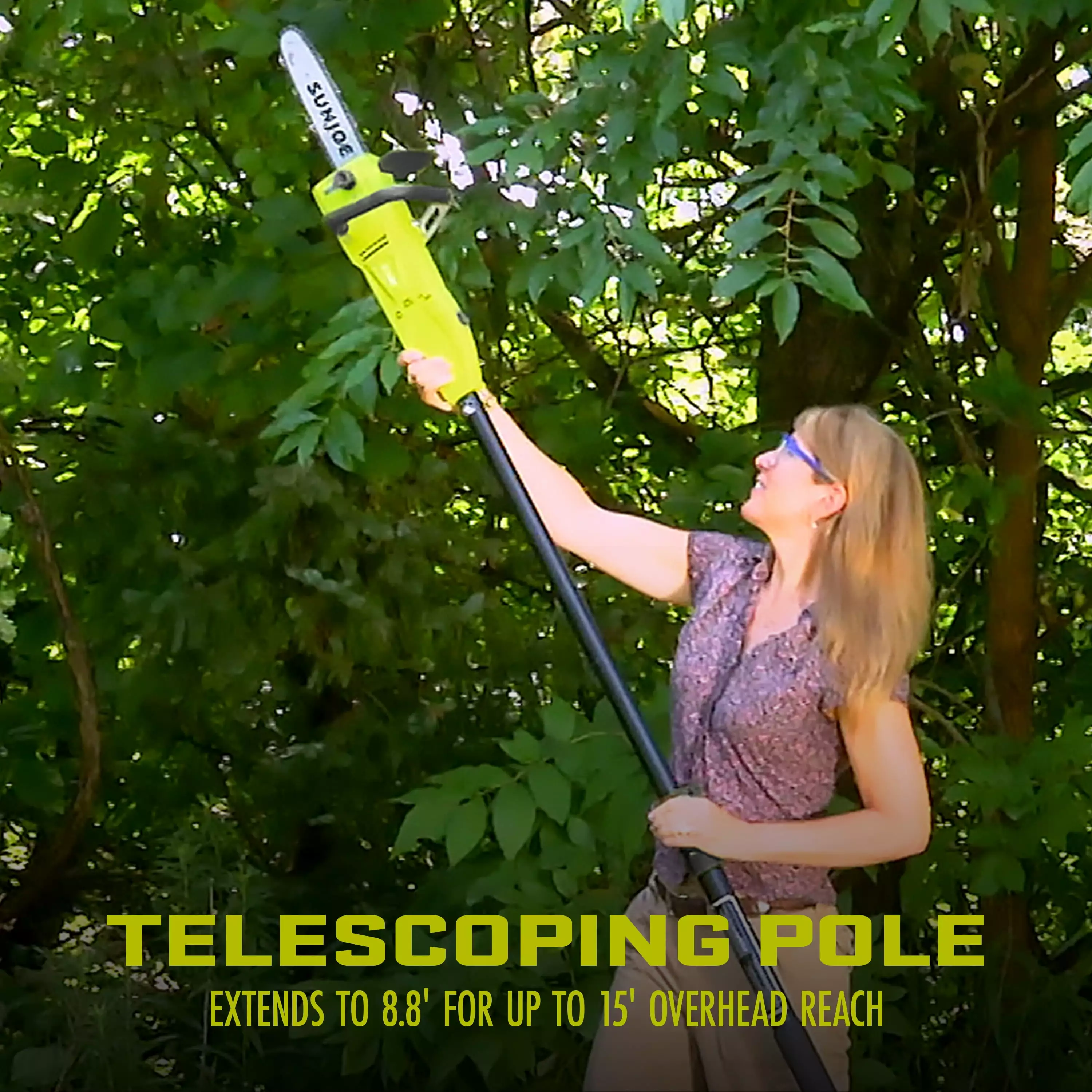 SAW WHAT YOU SEE ?C WITH THE ONE SAW THAT DOES DOUBLE DUTY! Tackle those hard-to-reach branches with ease. The Sun Joe® SWJ807E 2-in-1 convertible electric pole chain saw takes the danger and difficulty out of trimming your overgrown trees. Stand safely on solid ground and simply adjust the telescoping pole. Pole extends to 8.8 ft to gain up to 15 feet of overhead reach. Later. when the limbs are down and there’s wood to be cut. the SWJ807E quickly converts to a hand-held chainsaw to make light work of loads of logs. Powered by a robust 8-amp motor. the SWJ807E can handle the most stubborn tree limbs up to 9.5-inches thick. It features a durable. 10-inch Sun Joe® bar and chain with an auto-oiler to keep the bar and chain fully lubricated during use. Unlike gas-powered tools. SWJ807E is powered electrically. so you’ll power up reliably every time with the push of a button. without having to deal with smoke. fumes. spark plugs or costly tune-ups. Plus the SWJ807E comes equipped with a built-in safety switch to prevent accidental starting. The Sun Joe SWJ807E convertible electric pole chain saw carries a full two-year warranty.