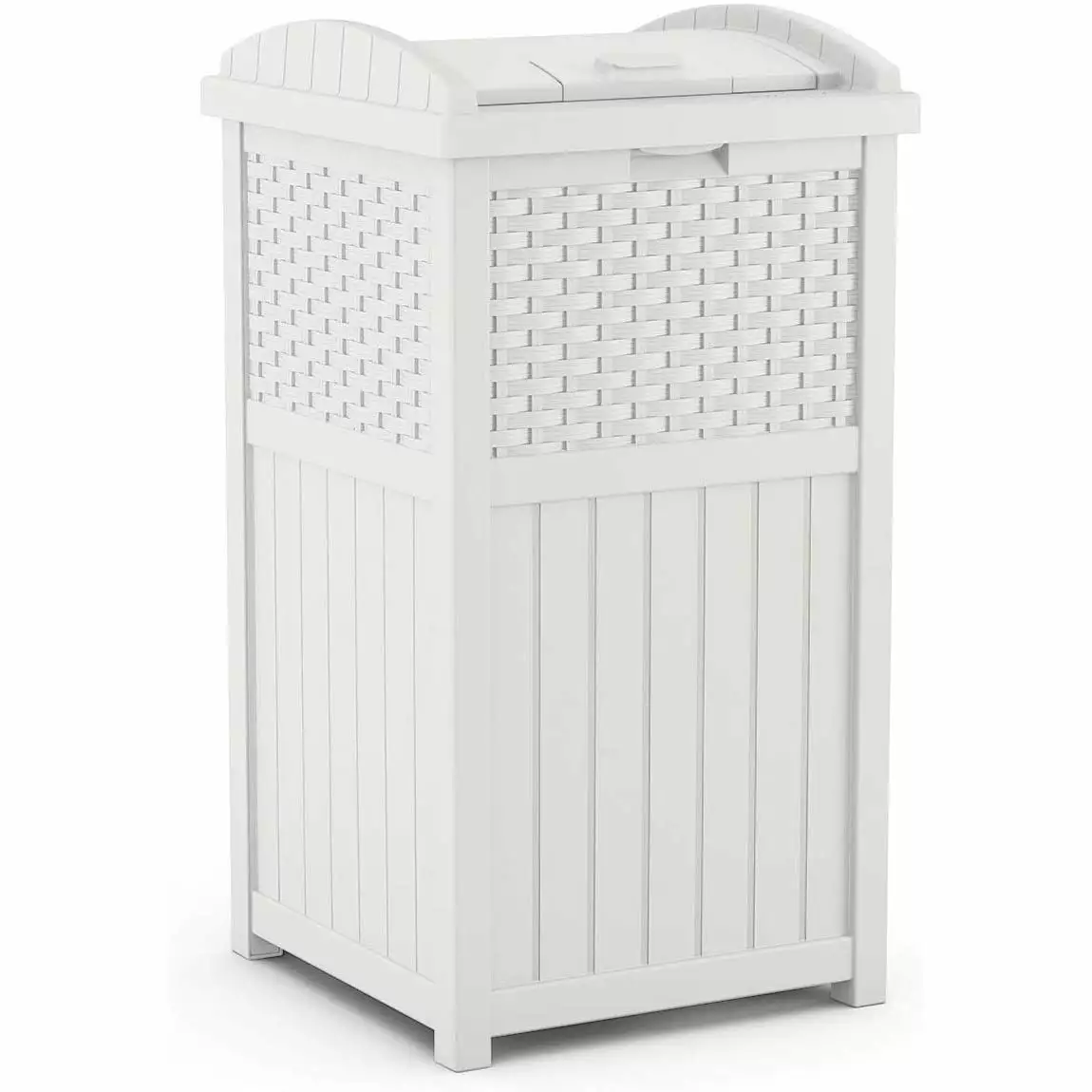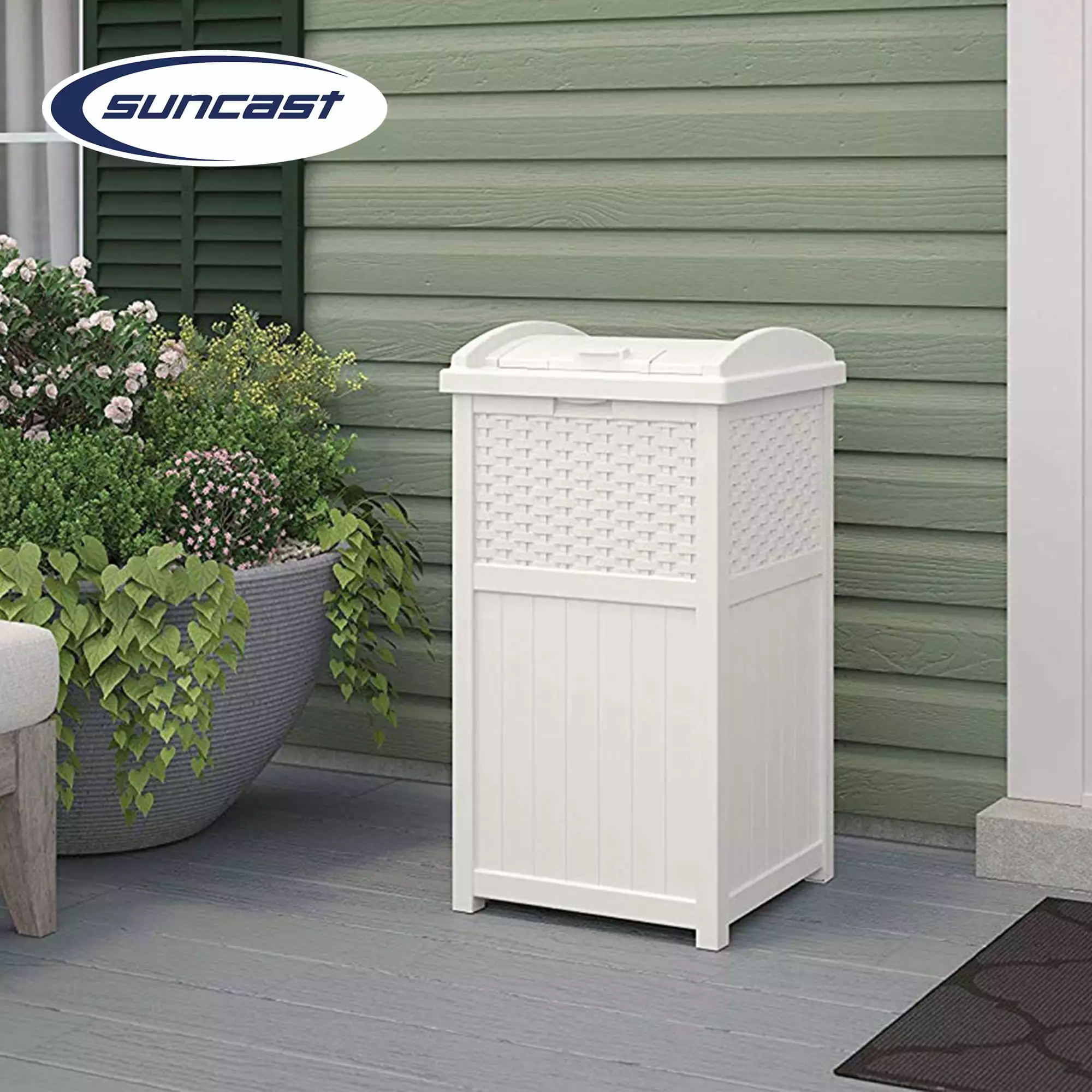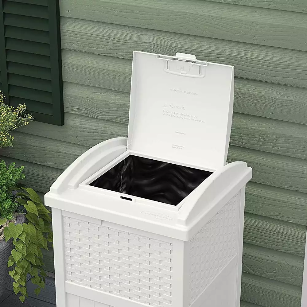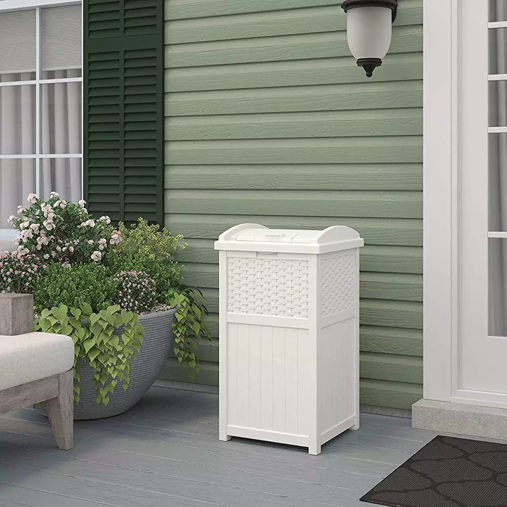 Don’t ruin the appearance of your front lawn or backyard with a messy. unsightly garbage can. Instead. opt for a practical and stylish approach to keeping your trash in one place with the Suncast Wicker Plastic Outdoor Hideaway Trash Can with Latching Lid. This garbage can with lid can also be used as a trash can. recycling bin or for storing your outdoor essentials. making it a versatile addition and solution for your home. Constructed of durable plastic for a strong and stay-dry exterior. this hideaway trash bin can hold between 30-33 gallon trash bags. It features a stylish wicker design that’s not only practical but looks good too. The sturdy base won’t tip over easily during storms or during periods of high wind. while the plastic material helps keep the can dry all year long. Designed with a latching lid. the Suncast Hideaway Bin is a practical and aesthetically pleasing addition to any kitchen. bathroom. or outdoor space. The latching lid ensures that your waste is kept out of sight. helping to maintain the cleanliness and order of your space. With its durable construction and sleek design. the Suncast Hideaway Bin is a reliable and stylish solution for your waste management needs. Keep your outdoor space free from any clutter and place your trash in a singular location with this hideaway trash can from Suncast.