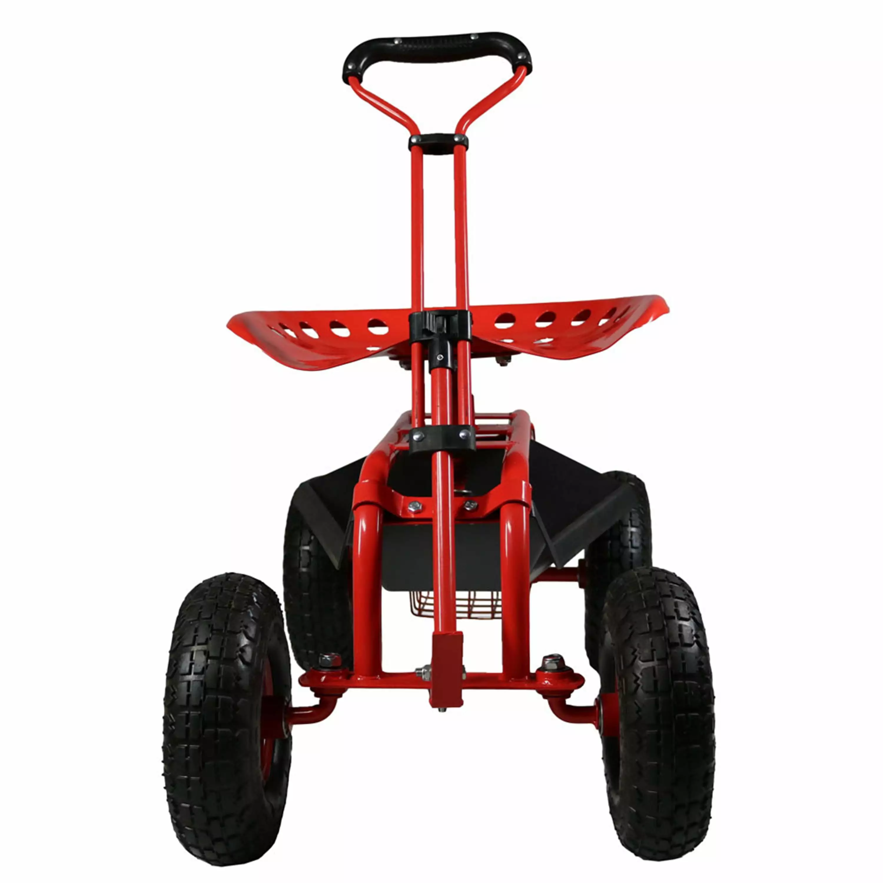 This rolling garden cart features a large. steel seat and an extendable handle that makes this garden cart a dream to use while working in the yard. Aside from the convenience. this cart is engineered to last with a heavy-duty. powder-coated steel frame. steel axles. an extendable steel handle. a matching steel wire basket. pneumatic tires with coated rims. and a black plastic tray for holding tools and other convenient items. The seat features a 360-degree swivel motion to face any direction needed to complete the job. Moving this cart is easy too. just pull the cart with the extendable steering handle. Use this handy swivel cart while working in the yard to alleviate back strain or to take a well-deserved seat whenever needed. And. finish landscaping jobs in half the time.