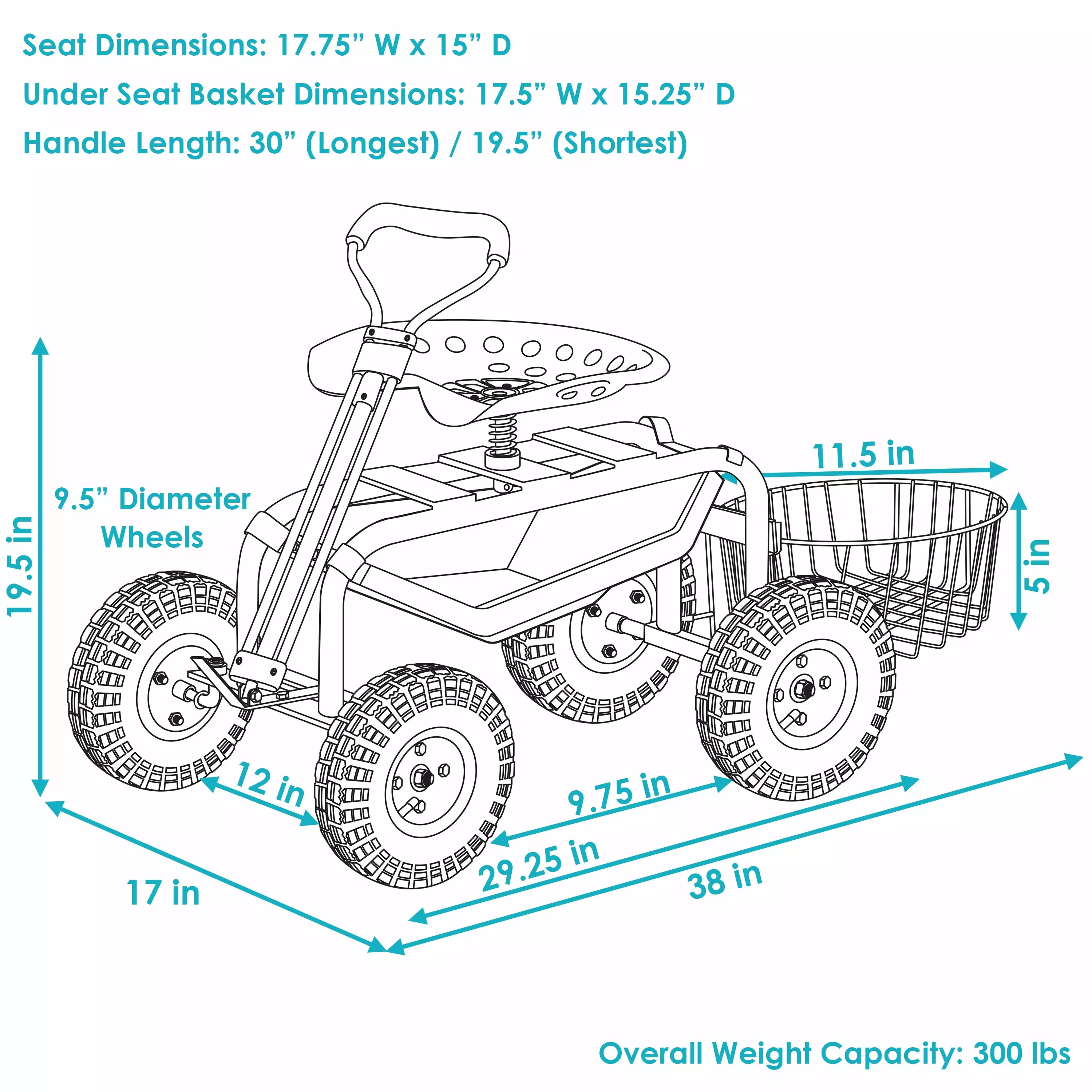 - ADJUSTABLE HEIGHT: This garden cart with seat measures 38 W x 17 D x 19.5 H (not including the handle). The extendable handle can be adjusted between 19.5 to 30 long. The seat measures 17.75 W x 15 D. It weighs 32 lbs and has a weight capacity of 300 lbs. The seat adjusts from 16.5 to 22 H for a comfortable height for working.