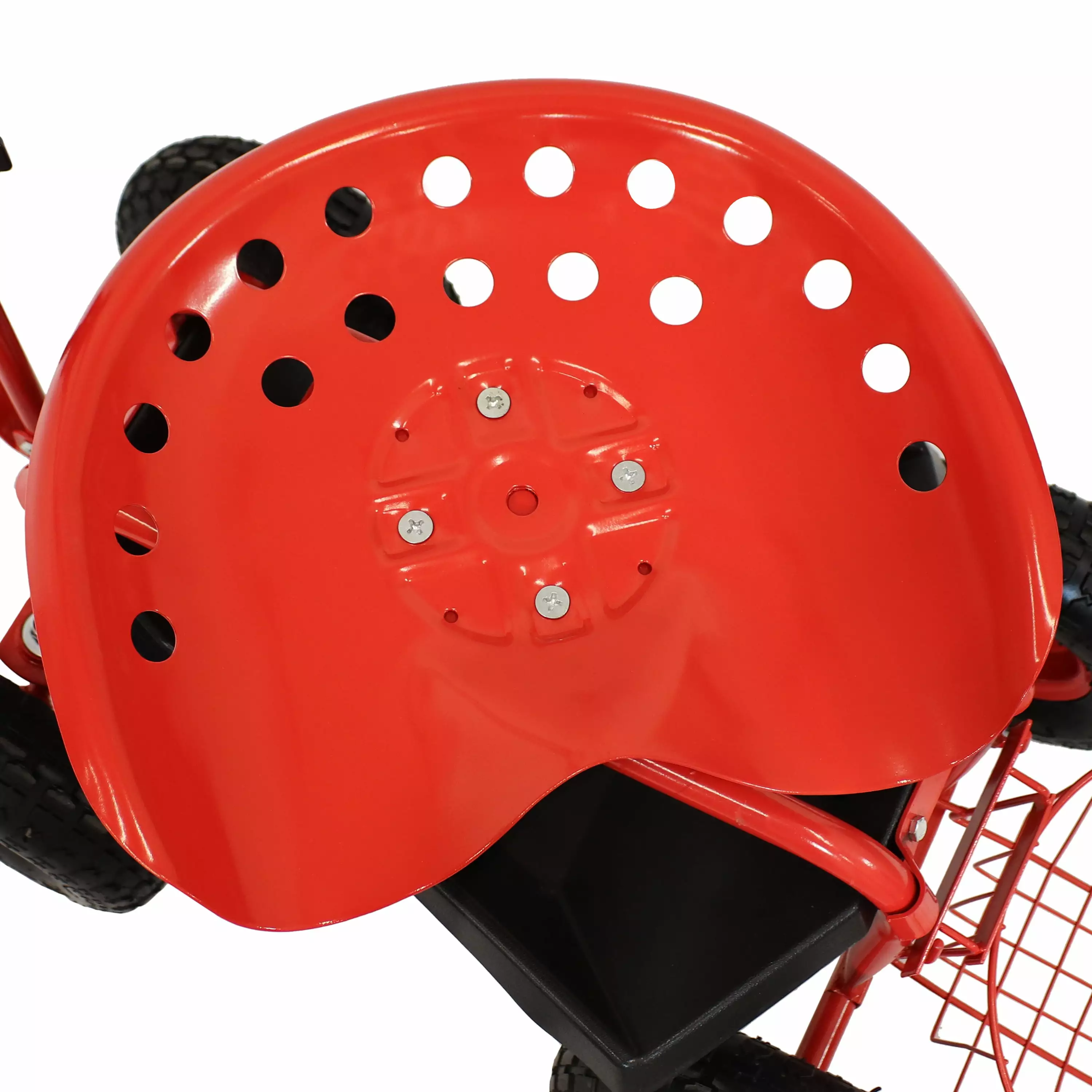 This utility cart will be an essential accessory for gardening or landscaping. especially with its 360-degree swivel. steel seat and extendable steering handle. Keep tools. materials. planters. and more handily available in the red steel wire planter basket. This utility cart is engineered to last with its heavy-duty powder-coated steel frame. steel axles. and pneumatic tires with red-coated rims. It also features a convenient plastic tray for holding tools. The extendable steering handle makes it easy to pull the cart across the yard to where it’s needed: easily roll through any gardening or landscaping job with ease. comfort. and purpose. Use this cart for work in the yard. lawn. farm. garage. or shed. This garden cart will resist the elements outdoors effortlessly with its steel construction.