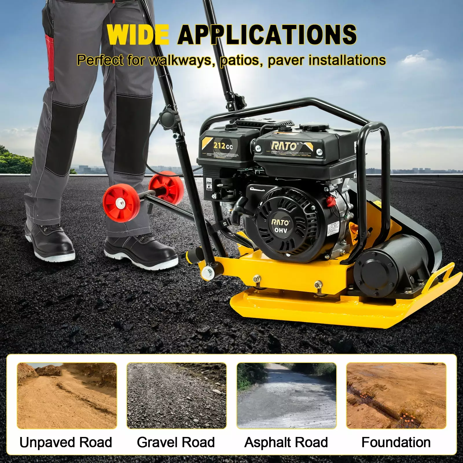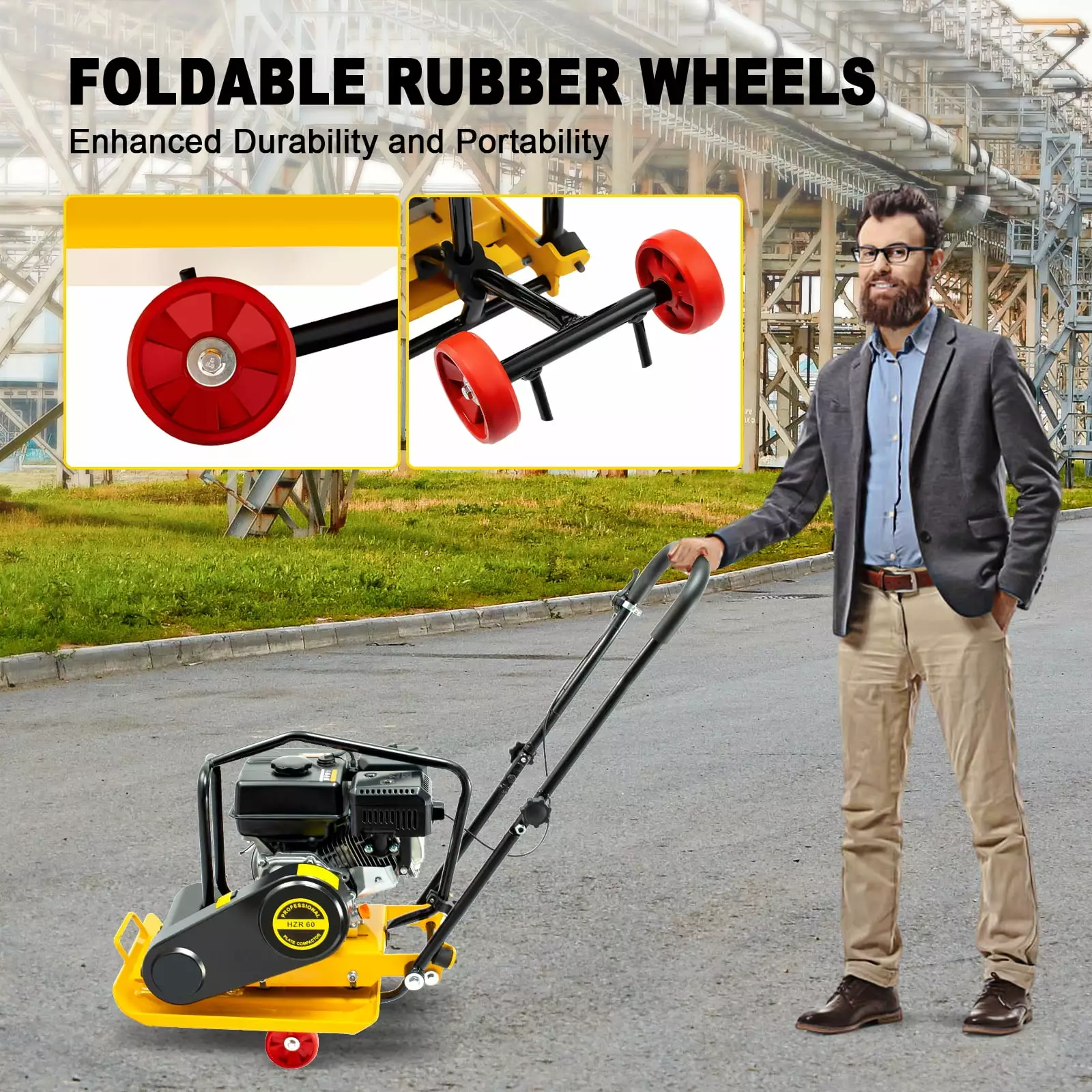??EASY TRANSPORTATION?? Our plate compactor is specially designed with an adaptive shock absorption system. and excellent shock absorption performance In addition. reinforced solid wheels for easy mobility. Foldable wheels & handles. easy to move. saving transportation spaces.