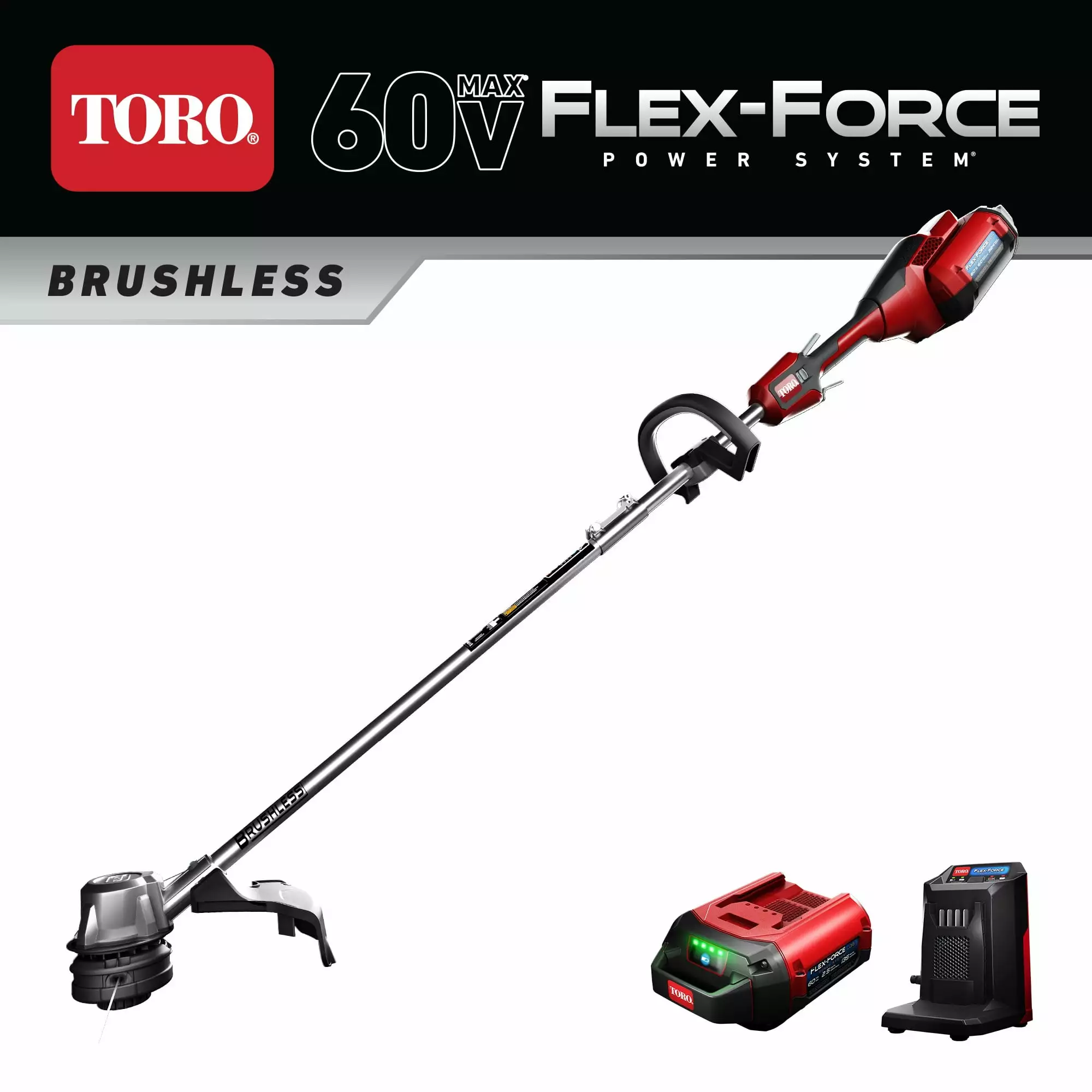 Unleash your inner yard warrior with the Toro Flex-Force Power System 60V Max Brushless String Trimmer. Including a lithium-ion battery and charger. you’ll have everything you need for a full day of work. With this grass trimmer. you get to choose between 14 inches or 16 inches of cutting length to satisfy your needs and customize with a speed that suits the job. That means you can accelerate your performance and productivity whenever you feel the need for high-performance yard work. The brushless motor. equipped with RunSmart onboard intel. optimizes RPMs and torque in real-time for peak cutting performance. No longer settle for mediocrity. This edge trimmer comes standard with a pro-grade 0.095-inch line. built to handle the thickest grass and toughest weeds. You’ll have the confidence to tame even the most unruly landscapes with ease. This trimmer possesses unrivaled power that dominates every task. leaving no job unfinished. The 60V Max Lithium-Ion Brushless Cordless String Trimmer from Toro will be the perfect addition to your garage tools. making yard work more enjoyable.