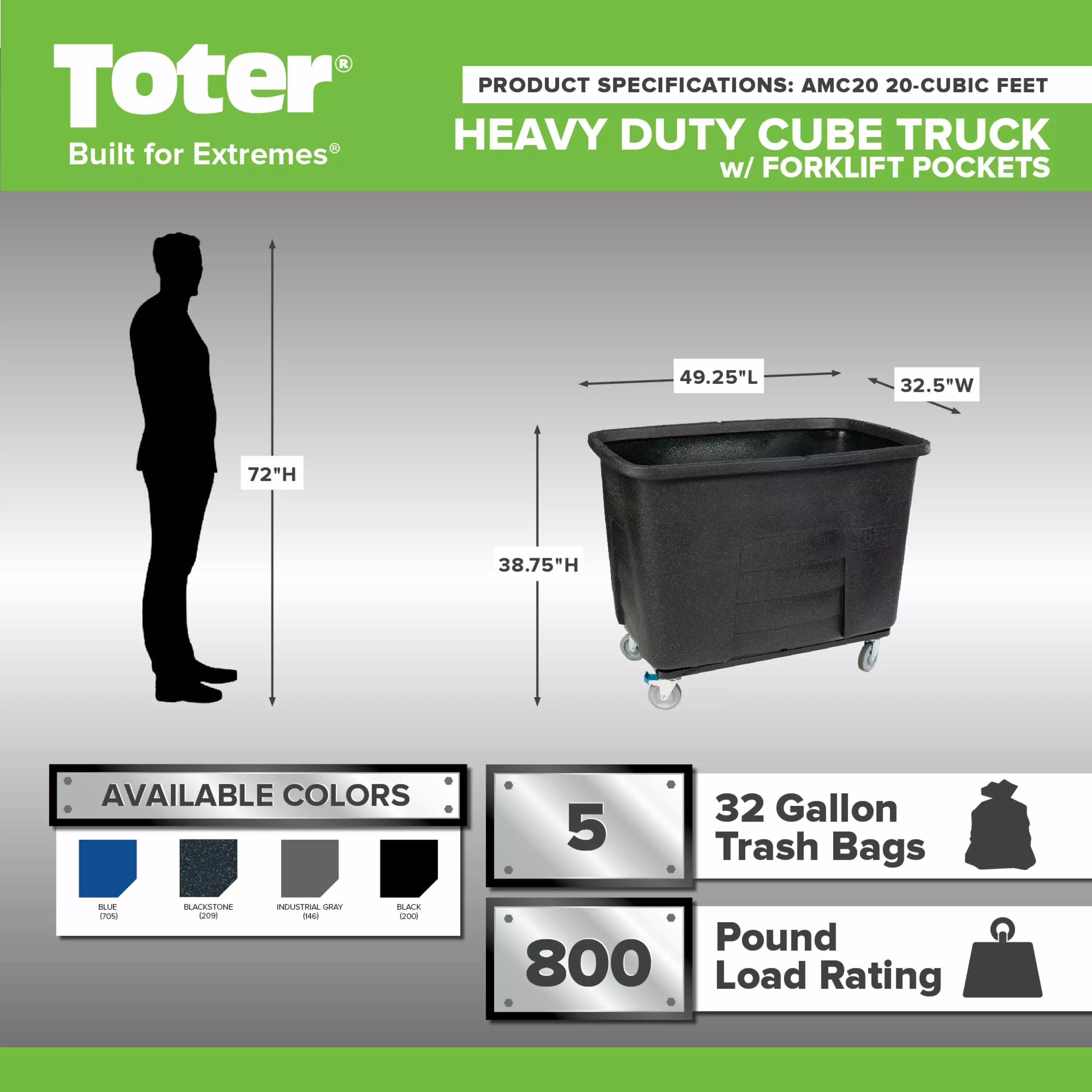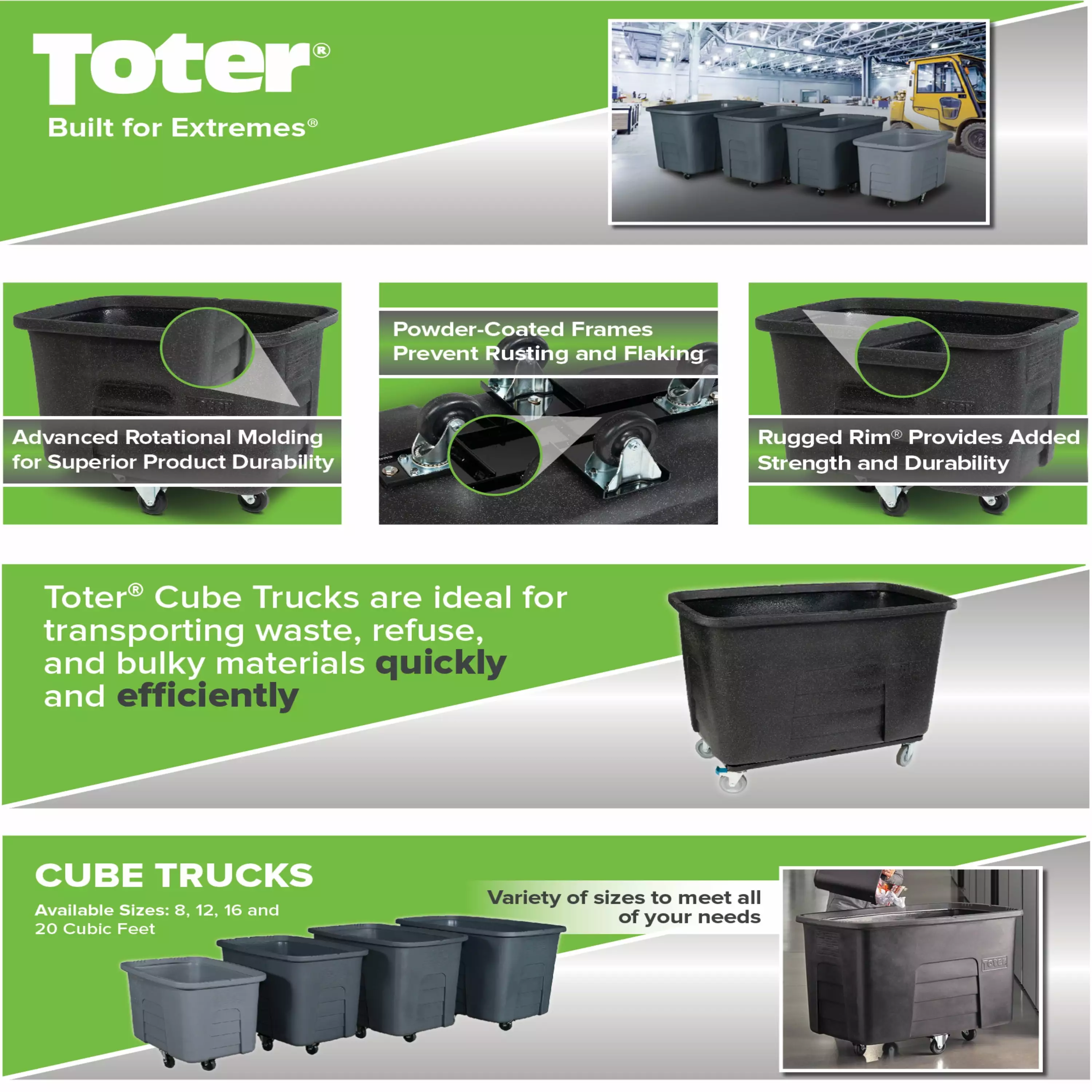 Toter’s Auto Cube Trucks are perfect for moving large. heavy waste to its final disposal area. Advanced Rotational Molding. using medium density polyethylene. allows for added rigidity and extra material in critical wear areas – creating their Rugged Rim at the top edge. Recessed gripping areas make them easy to maneuver the heaviest loads. Powder coated frames reduce corrosion. prevent flaking and ensure long service life. The addition of forklift pockets and compatibility with Universal Lifters allow the trucks to be easily moved and emptied. protecting your employees from injury. Ideal for general waste. material handling. manufacturing waste. food waste. and recycling.