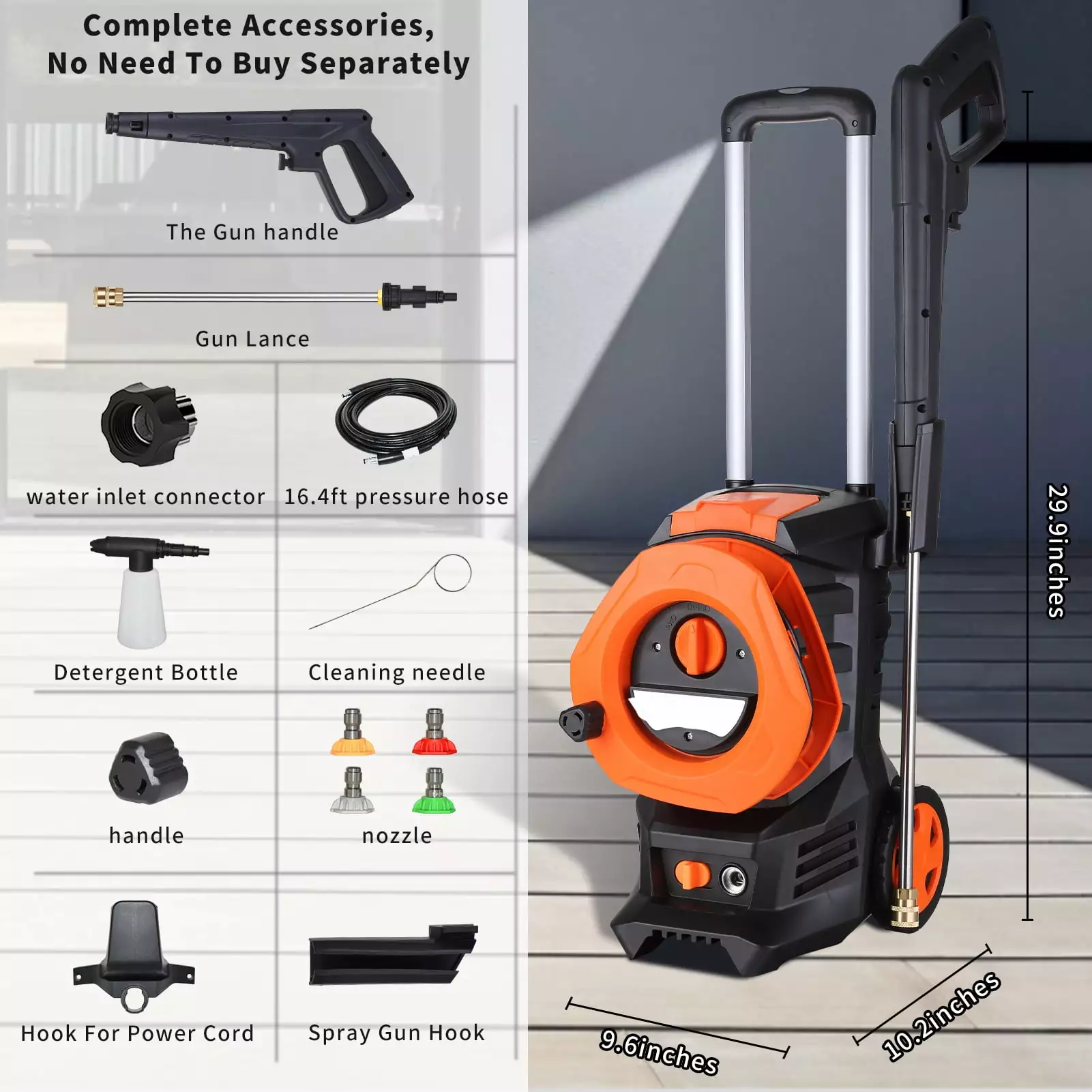 EASY TO MOVE AND STORAGE–The high pressure washer is equipped with large. sturdy wheels so you can move it anywhere. anytime. Long high pressure hoses can be hooked up to the machine. The power cord can be hung on the power cord holder. Hose and most accessories can be stored directly on the device. saving space and easy access to the maximum extent