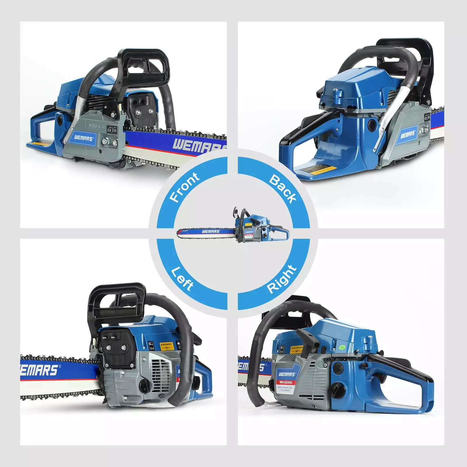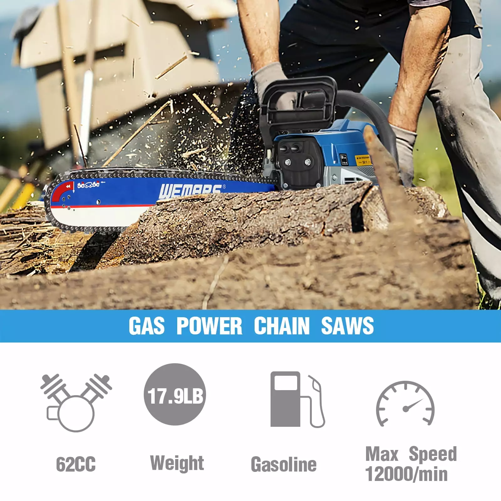 - High Performance: WEMARS 62cc 20 inch powerful gas chainsaw with guide bar and chain for cutting wood that need a longer bars. 2 stroke motors with integrated chain brake for safety and stable while operating. Low kickback safety function and excellent electronic ignition system can reduce the risk during operation