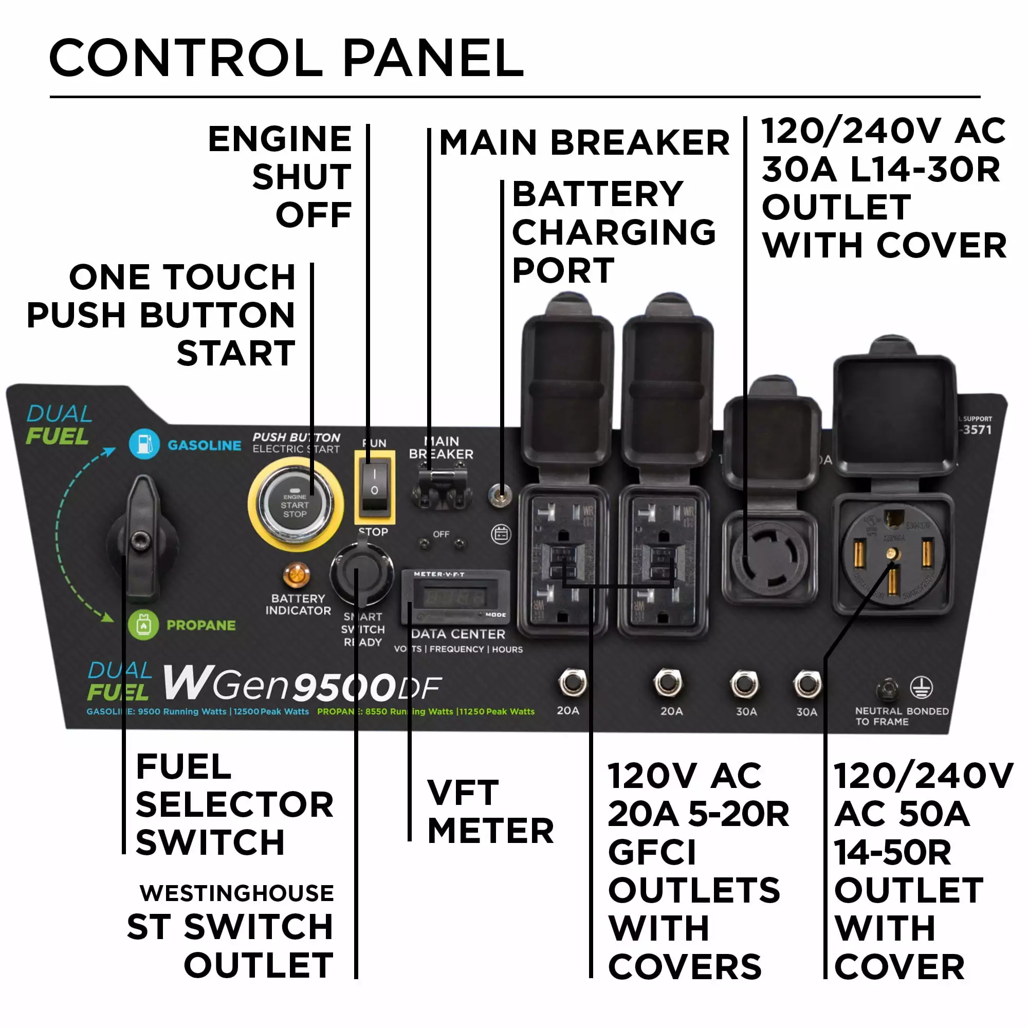 The Westinghouse WGen9500DF Dual Fuel Portable Generator produces up to 12.500 peak watts and 9.500 running watts. The WGen9500DF is a dual fuel generator that operates on gasoline or propane (LPG). The heavy duty 457cc 4-Stroke OHV Westinghouse Engine is constructed of a durable cast iron sleeve and runs for up to 12 hours on a 6.6 gallon (25 L) gas tank. keeping you powered through the day with built-in fuel gauge. automatic low oil shutdown. and GFCI outlets. Push-Button Electric Start makes starting the WGen9500DF effortless while the remote start key fob offers added ease from a distance. Its intuitive control panel spotlights the Transfer Switch Ready L14-30R and larger 14-50R to power your major appliances like the air conditioner. refrigerator. and sump pump as well as any lights or entertainment centers all at the same time with a single cord hookup. VFT Data Center displays volt output. frequency. and lifetime hours to keep you up to date with real-time information and regular maintenance. Conveniently portable with an included set of heavy duty never-flat wheels. handle. and lift bracket. it’ll have your house. travel trailer. or jobsite powered in seconds. The WGen9500DF is 211 lbs and is complete with a 3-Year Limited Warranty and Lifetime Technical Support backed by our nationwide customer service and support network.