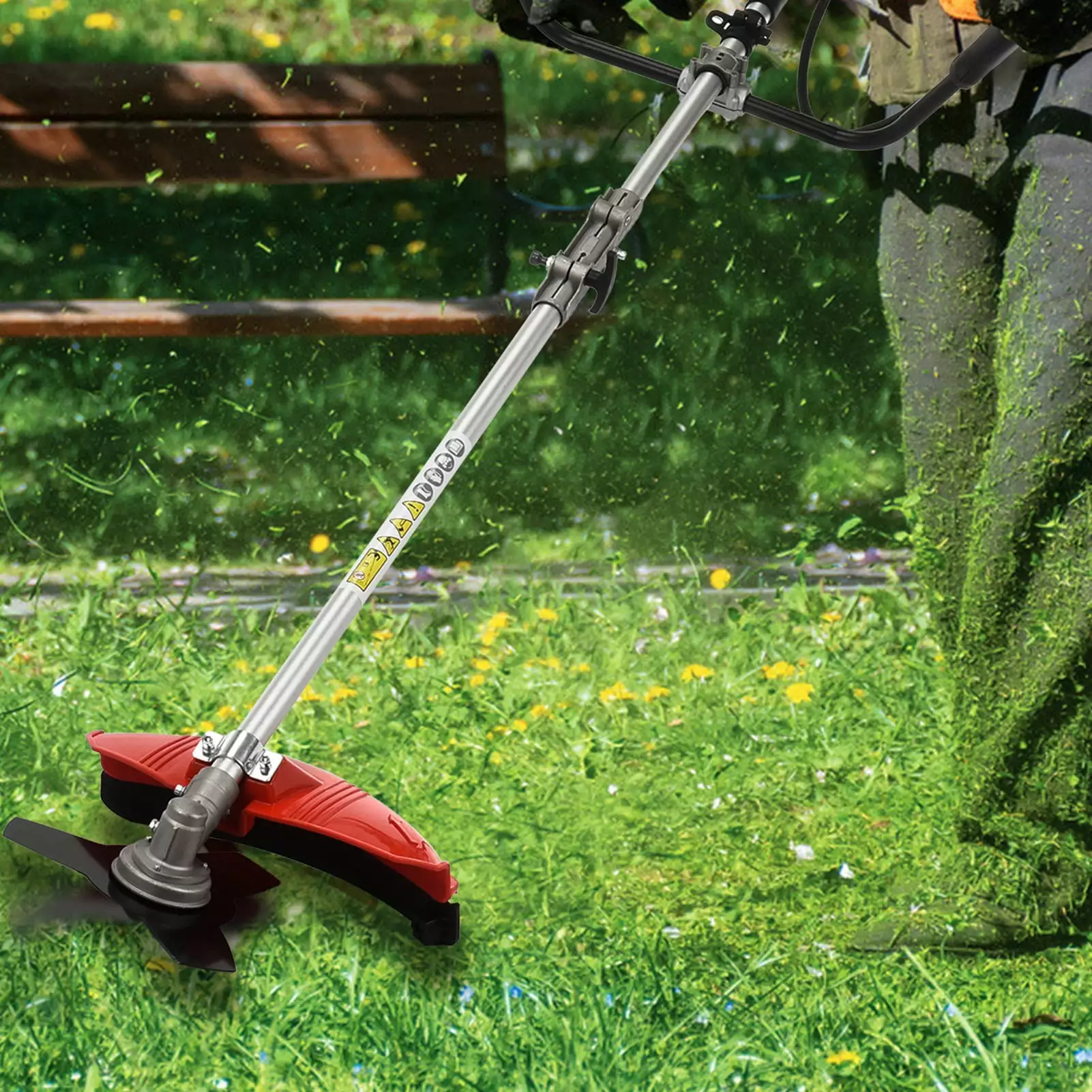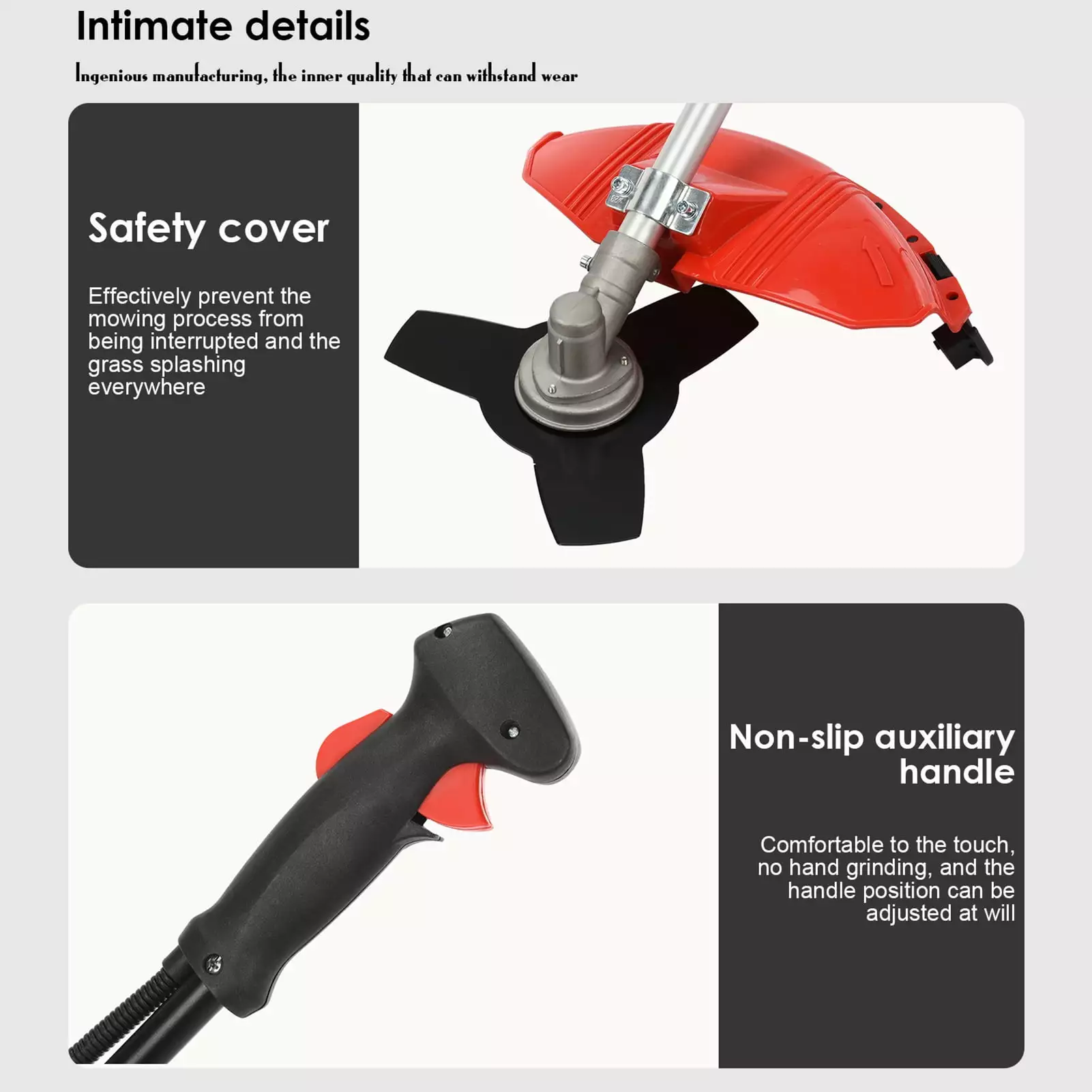integrated strap and U-handle for superior stability and simple operation.Driven by a 2.2KW super power engine. the speed of this string trimmer can reach 8500rpm. 52cc quick start engine make this brush cutter perfect for thicker weeds and brush. Side mount type is convenient for you to carry it while trimming.This gas-powered trimmer is designed to trim and weed out the annoying brush and high grasses that accumulate around garden fences. porches. flower gardens and pathways. a must-have for small yards and quick shape ups.