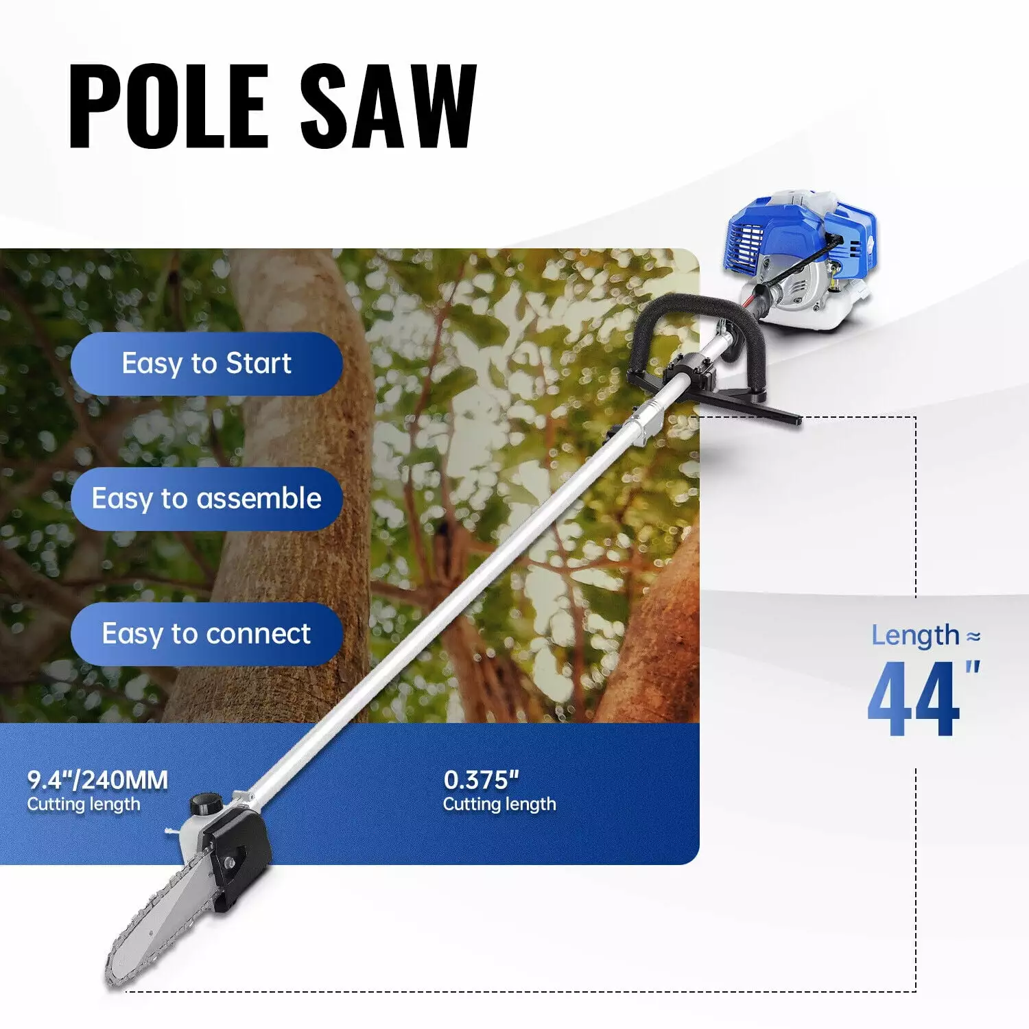 - Pole saw attachment articulates 90 degrees allowing you to make multiple cuts from different angles