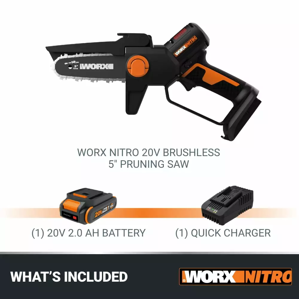 High-powered. pro-grade cutting is never a chore with the Worx Nitro 20V Brushless 5 Cordless Pruning Saw. Refined with an ultra-compact design and lightweight body profile. this pruning saw is easy and comfortable to maneuver??even during extended use or when working in tight spaces. The battery-powered cordless capability offers an extended run time that allows for truly on-the-go cutting. Rely on this impressive mobility to cut firewood at campsites. clear branches on hunting trails. trim trees on large properties. and much more. The 5 bar length is ideal for a variety of cutting tasks??including pruning. trimming. delimbing. and bucking. The high-efficiency brushless motor heightens the saw’s performance by providing 50% longer run time. 25% more power. a 10X longer life than standard brushed motors. For added convenience. the pruning saw features automatic chain-tensioning for quick and secure chain adjustments. In addition. onboard chain lubrication sustains cutting efficiency without hassle. as well as extends bar and chain life. Safety is prioritized with the retractable bar and chain guard. which retracts automatically when cutting from above. The guard can also be retracted manual when you need to undercut. Whatever the task. rely on the guarded handle design to maximize control while increasing safety and security.