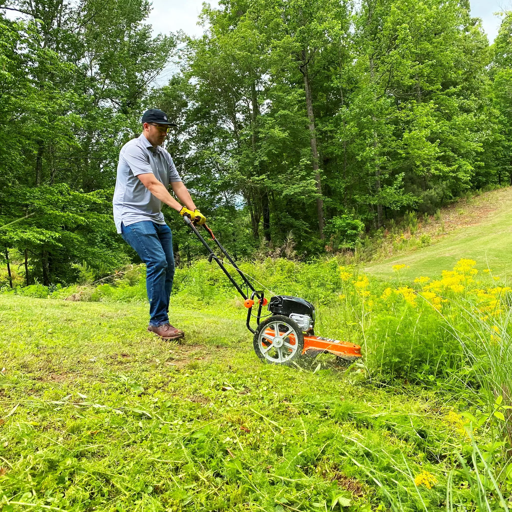 The Yard Force YF22-HWT High-Wheeled Trimmer is the ultimate trimmer to help cut down overgrown grass and weeds or difficult to reach areas including fence lines. around and under brushes and hedges. uneven terrain and along rock walls and landscaping – helping you cut big projects down to size. The 14-inch wheels allow the field trimmer to roll easily over uneven terrain while the anti-vibration foam grip handle provides maximum comfort and control. This High-Wheeled Trimmer is in a class of its own with the Briggs & Stratton 163cc engine. Easy starting with Briggs & Stratton’s ReadyStart® starting system ?C No prime or choke. just pull the start cord and you’re on your way. Easy maintenance ?C this engine never needs an oil change with Briggs & Stratton’s Just Check & Add? technology. Simply add oil if it’s low. Yard work made easy?