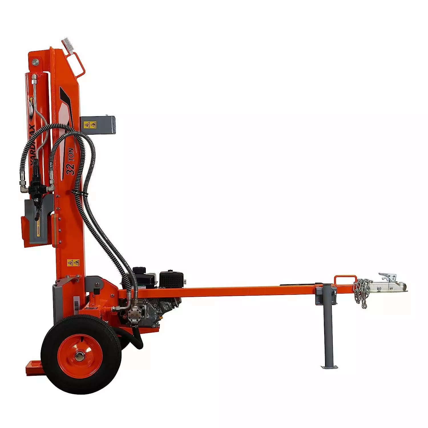 This 32-ton full-beam high-powered wood splitter is sturdy enough and powerful enough to handle heavy-duty log splitting jobs. The patent-pending U-beam design is significantly stronger and more durable than the typical I beam found elsewhere. Powered by a Briggs and Stratton Cr950 engine. and ergonomically designed for optimal performance. safety and ease of use. this horizontal and vertical log splitter cuts through wood effortlessly and efficiently. log after log. The size and weight make it a great option for frequent towing. Other features included as standard are protective log cradles on both sides. solid stamped steel fenders.