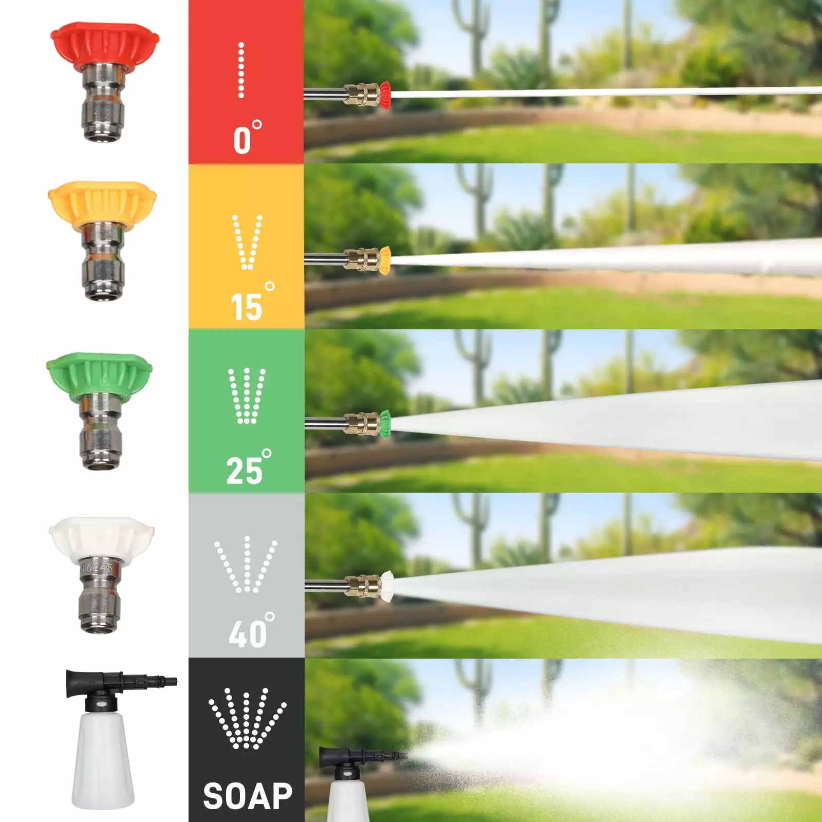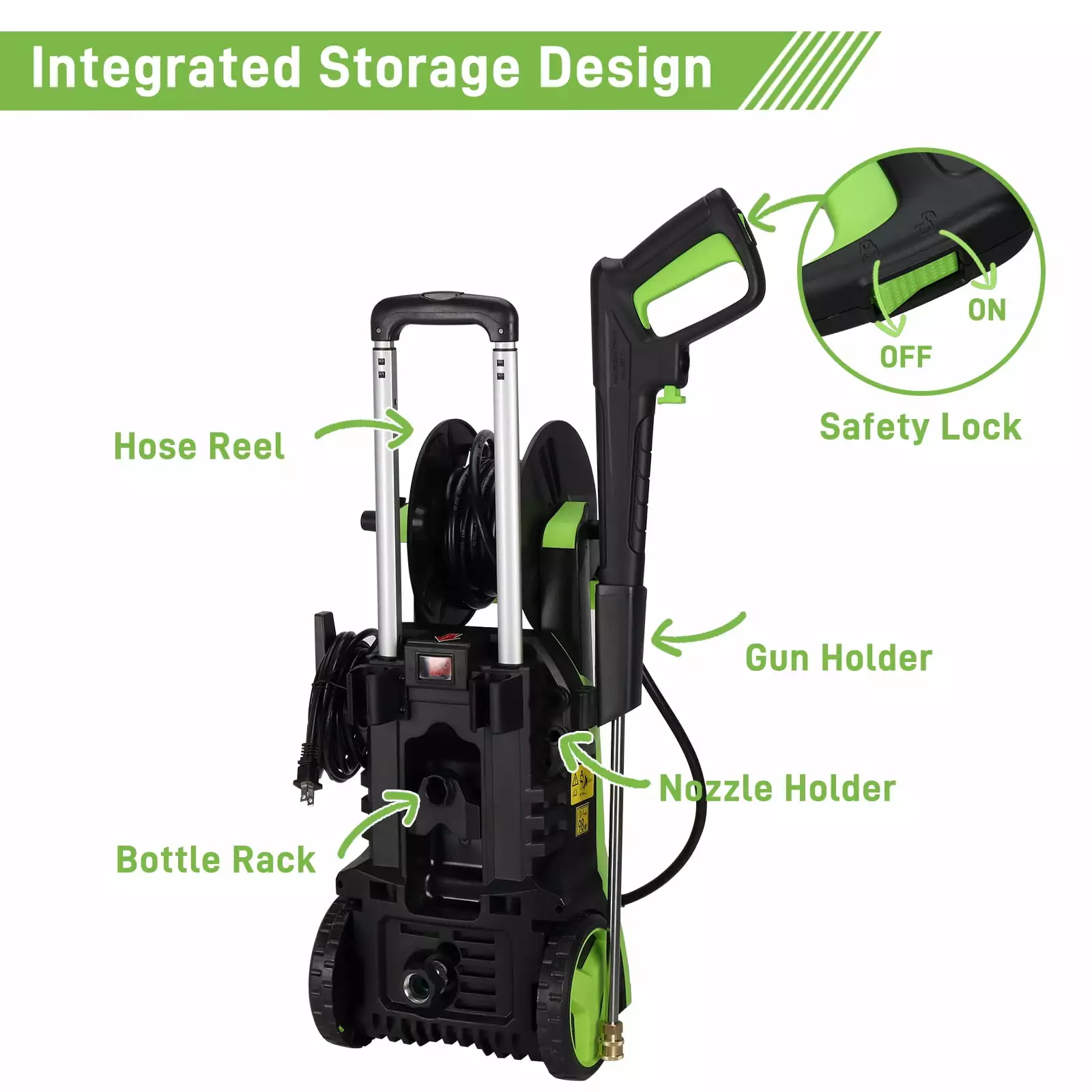 ??4 Quick Nozzles & Foam Bottle??This high-power washer machine has 4 quick-connect spray tips (0o. 15o. 25o. 40o ). which let you do any tougher cleaning jobs. The soap bottle allows you to wash your car or porch with rich bubbles. giving you much better cleanliness.